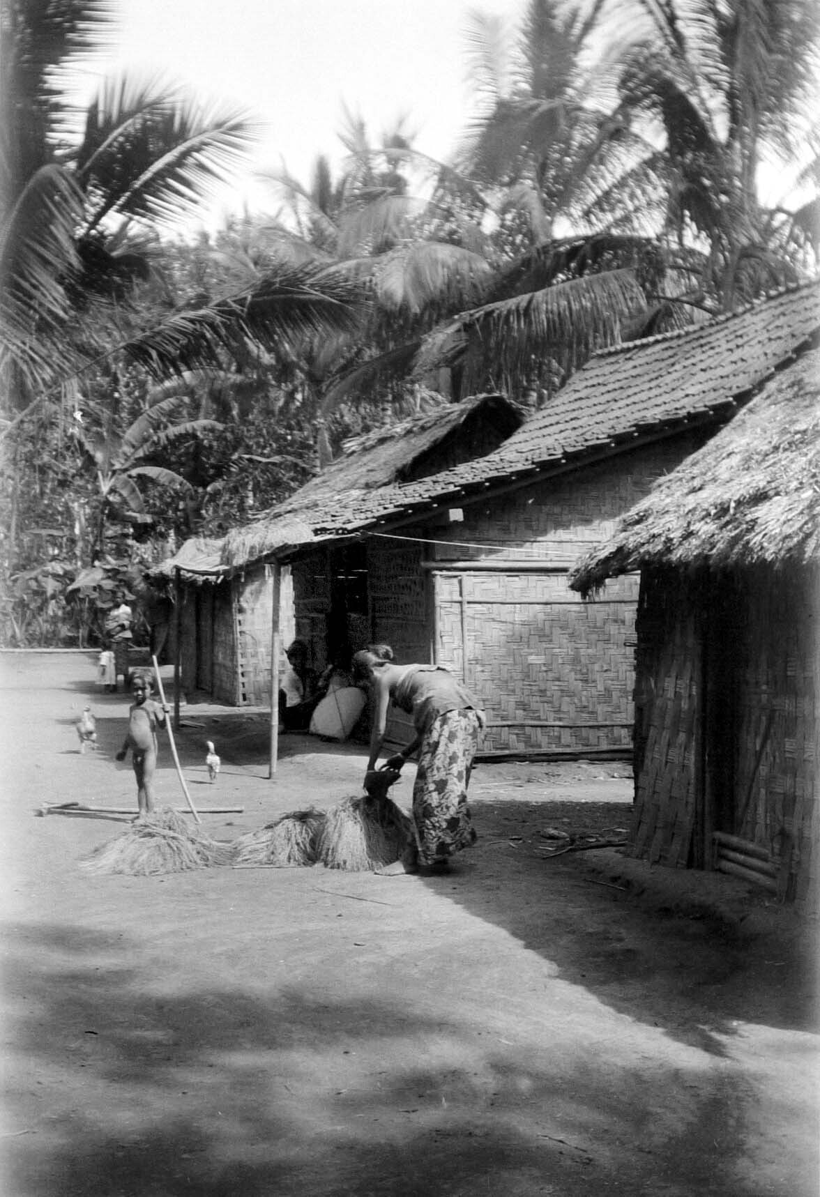 Een vrouw en een kind in een kampong te Dampar, Oost...