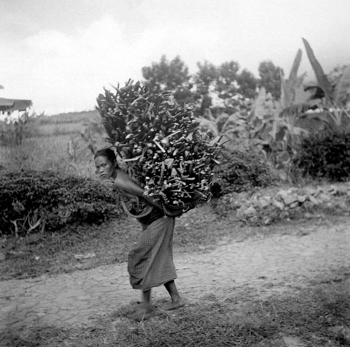 Een vrouw met een vracht sprokkelhout opweg naar de ...