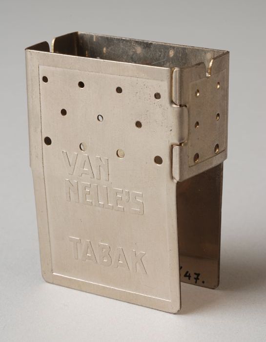 Metalen houder voor luciferdoosje met opdruk "VAN NE...