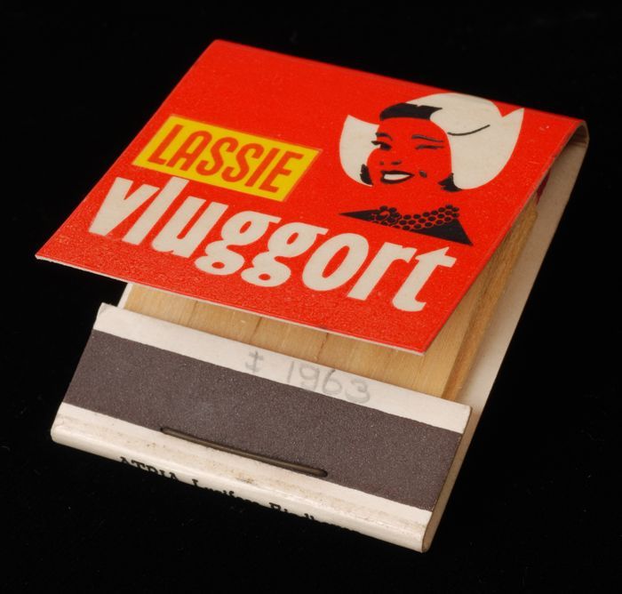 Lucifermapje met afbeelding vrouw en "LASSIE vluggort"