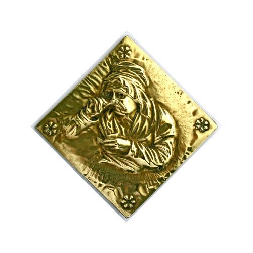 Messing plaatje, snuivende man.