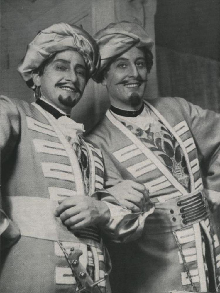 Vel met twee foto's: links twee acteurs in semi-moor...