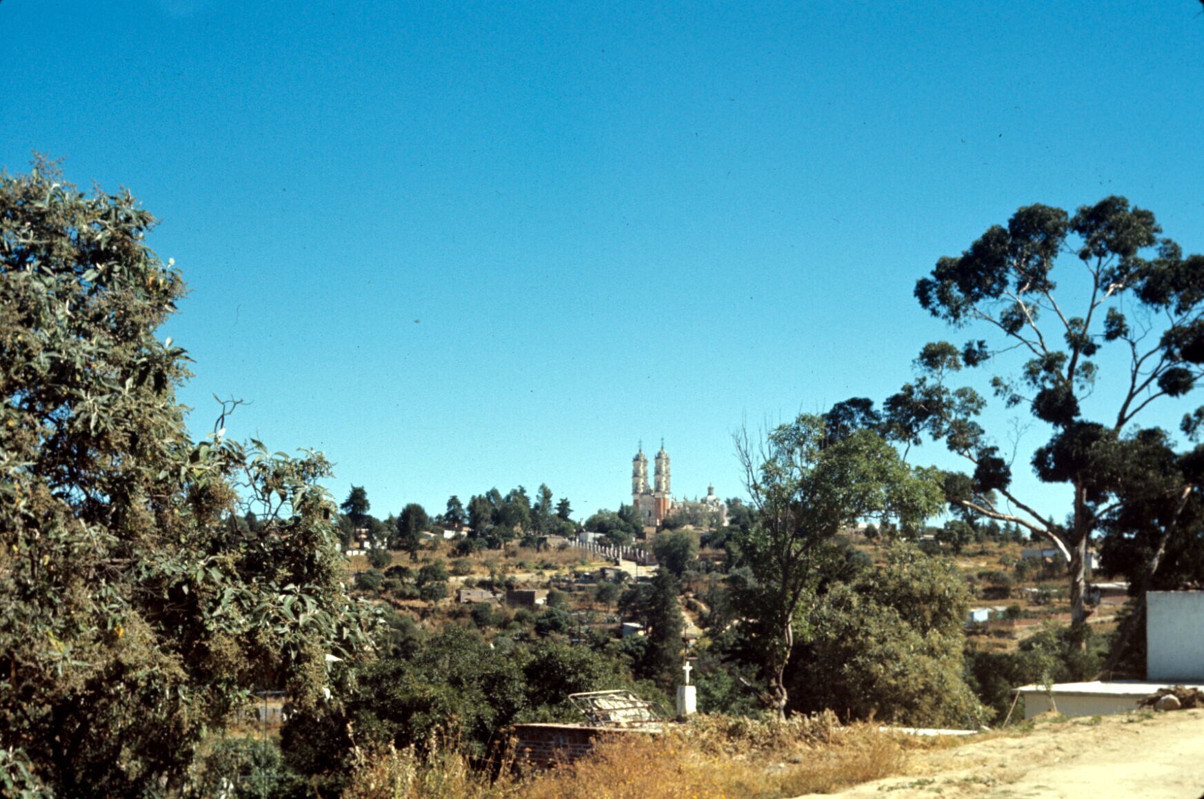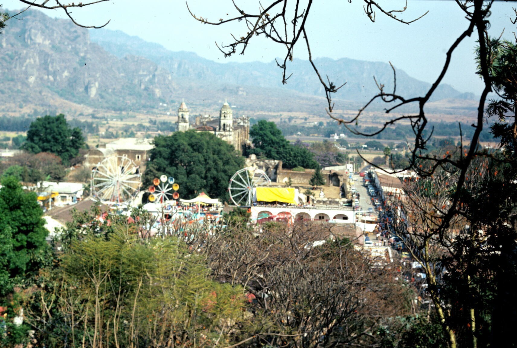 gezicht op de plaats met 'feria' (kermis) bij kerk