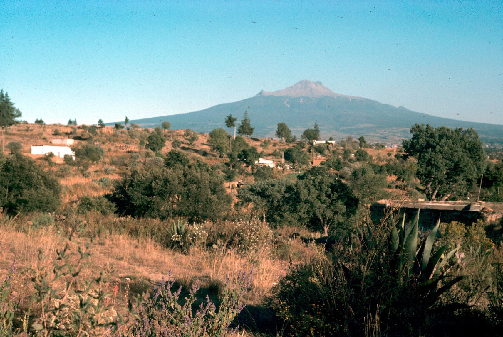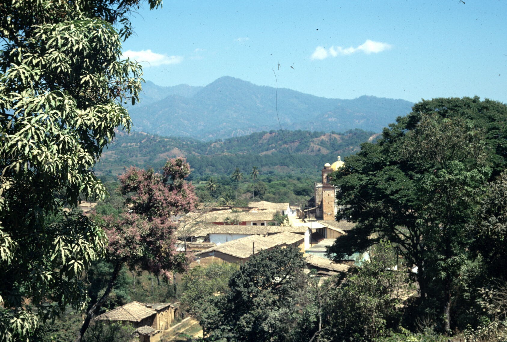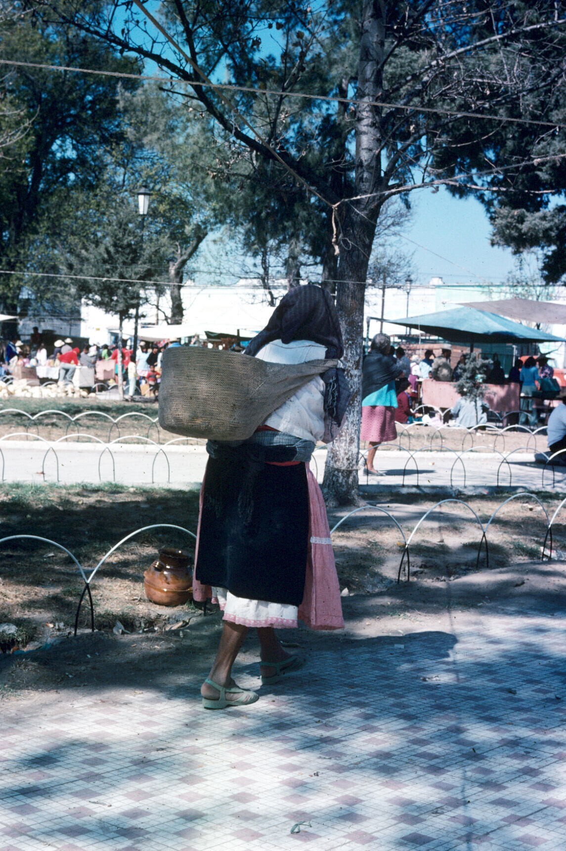 vrouw met rebozo (omslagdoek) op hoofd, op rug gezie...