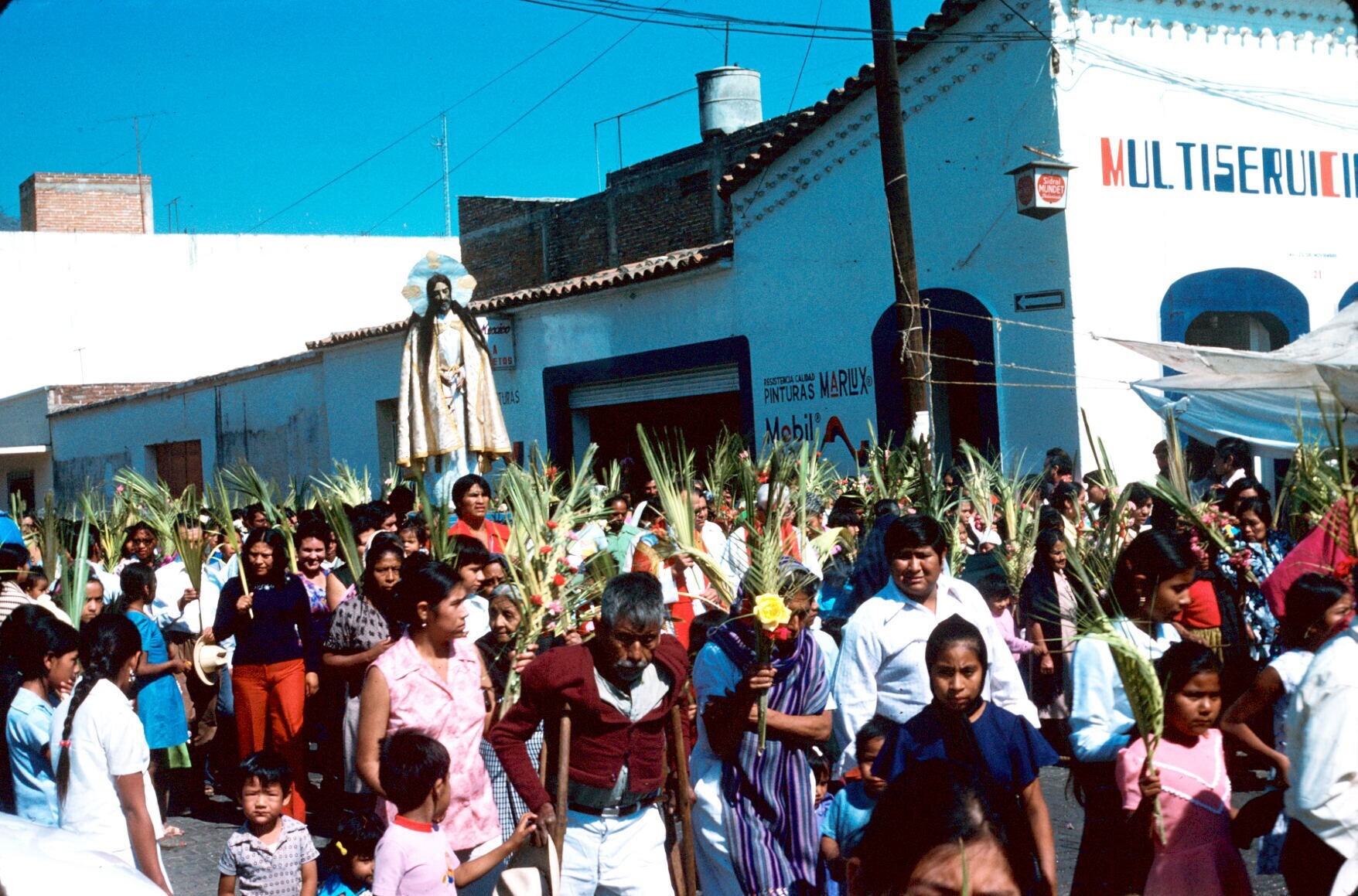 processie met palmtakken bij kerk, met rokend vuurwerk