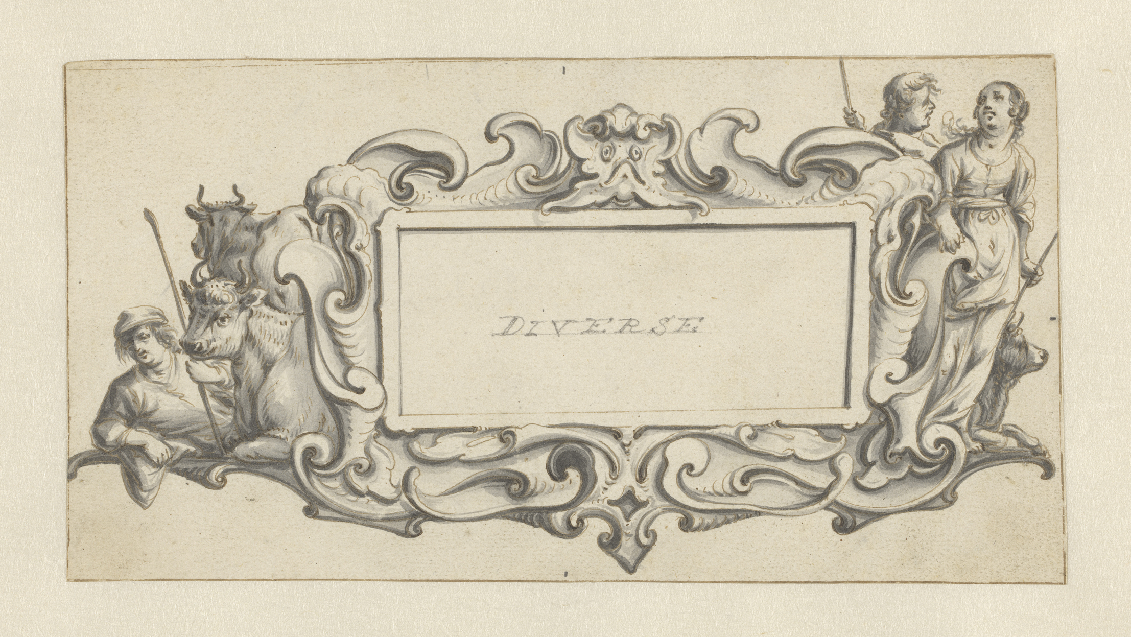 Cartouche met aan weerskanten herders en koeien