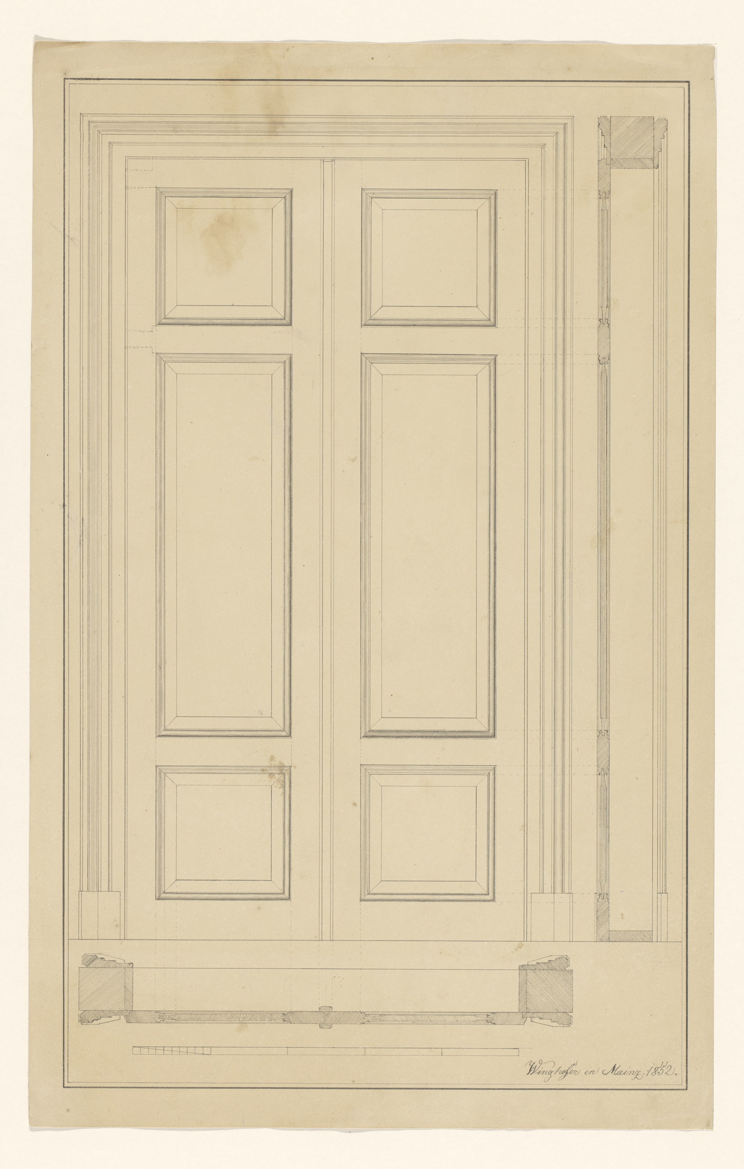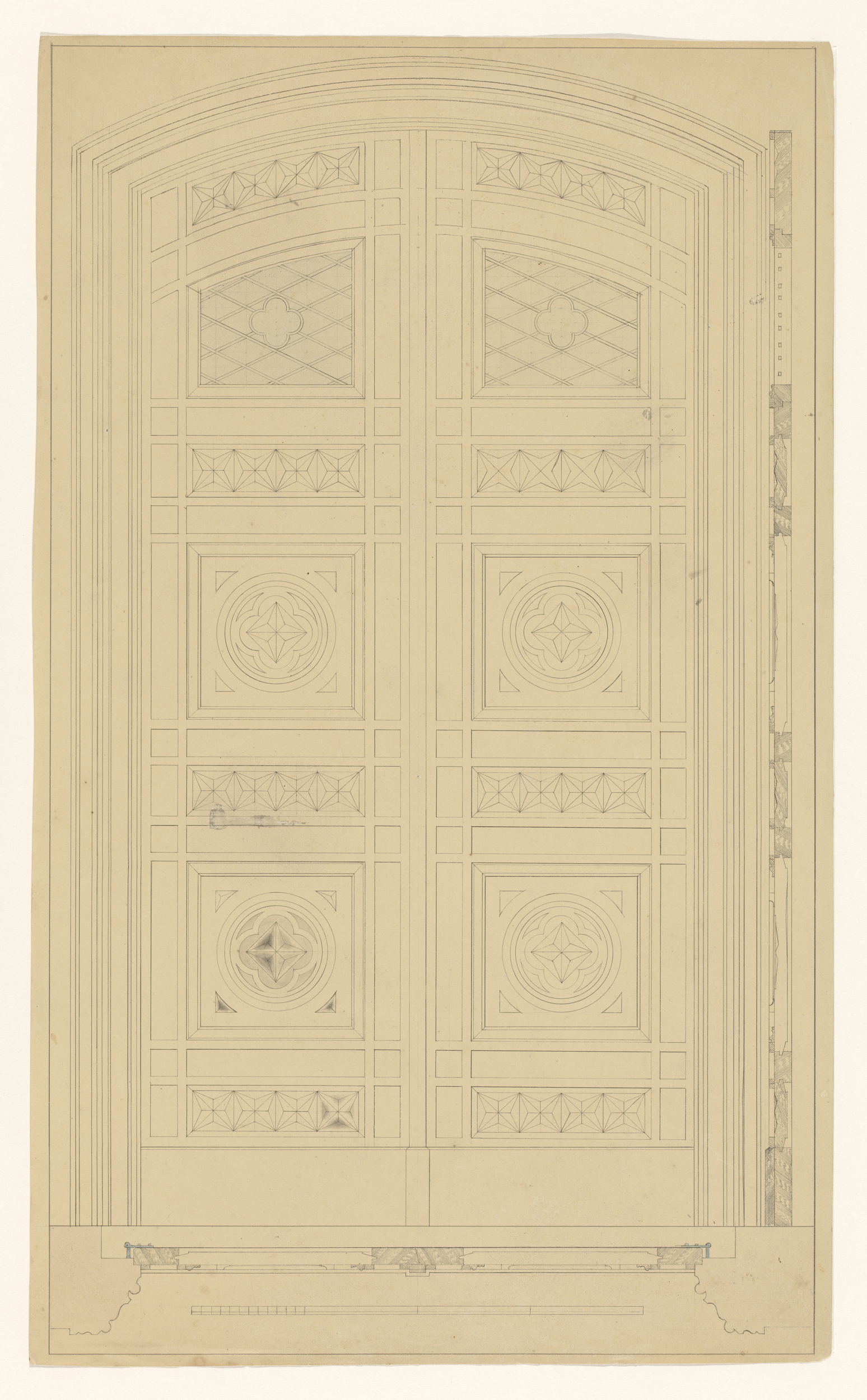 Ontwerp voor een dubbele deur, met zijaanzicht en pl...