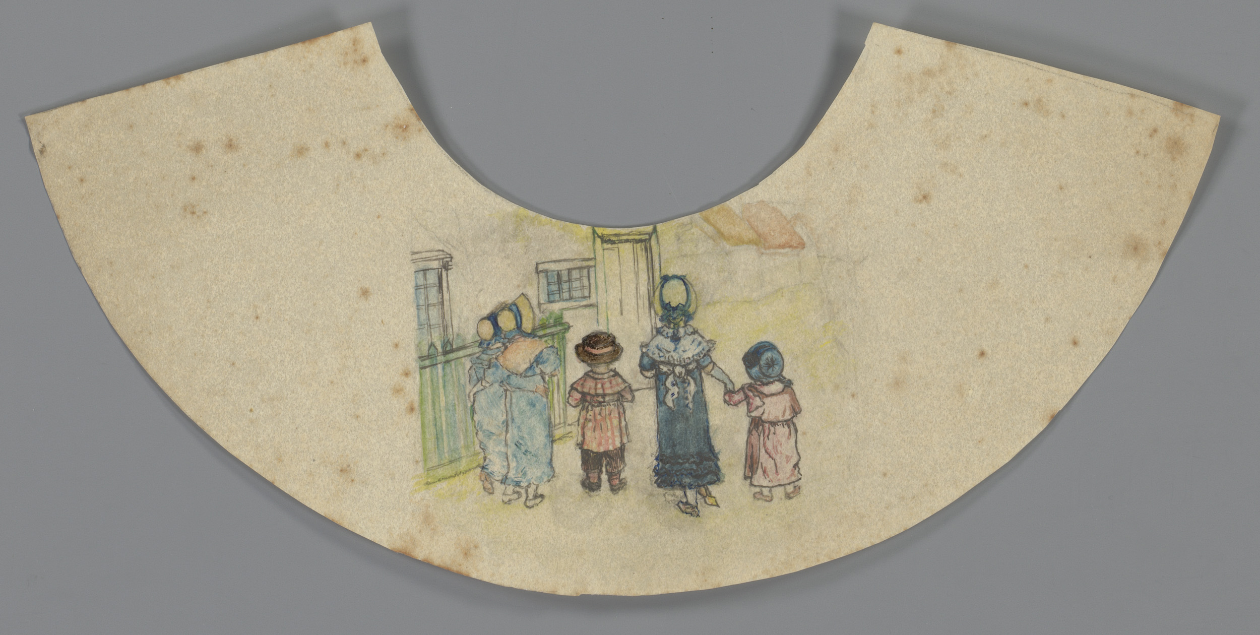 Vijf kinderen op de rug gezien bij een voordeur