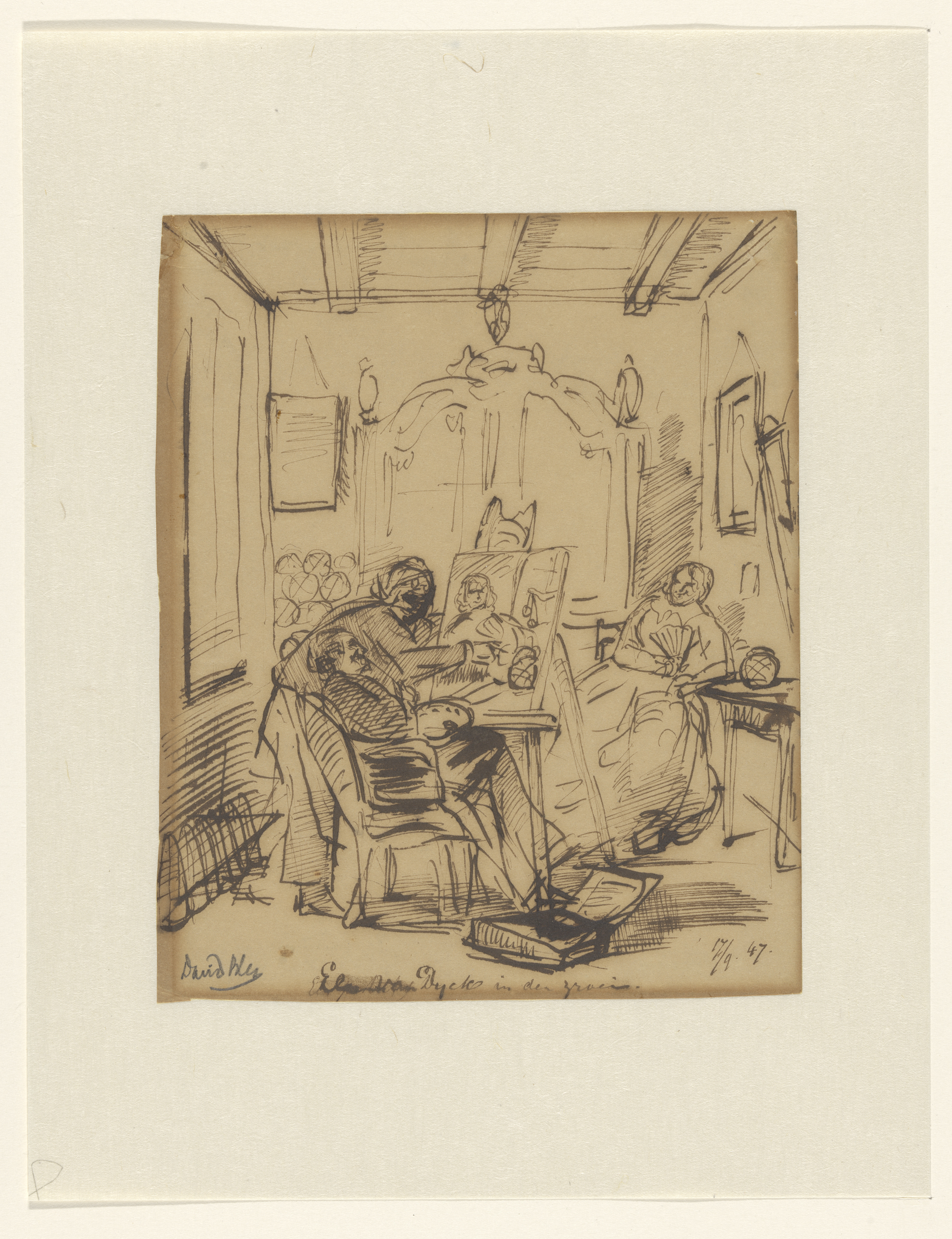 Portretschilder in een interieur, met zittend model ...