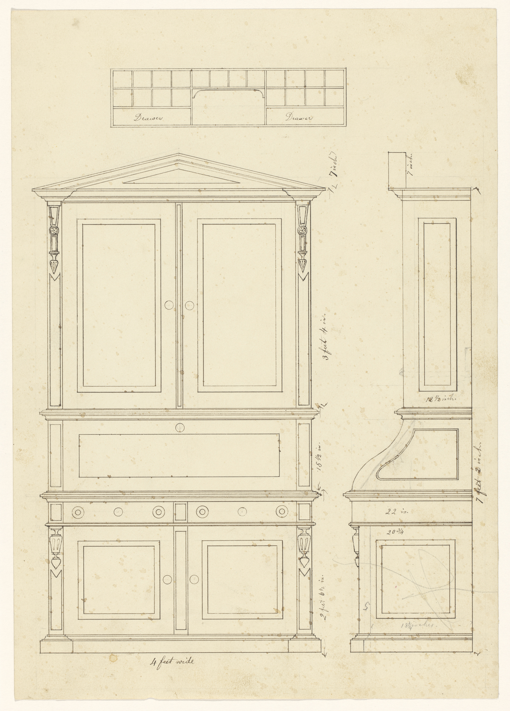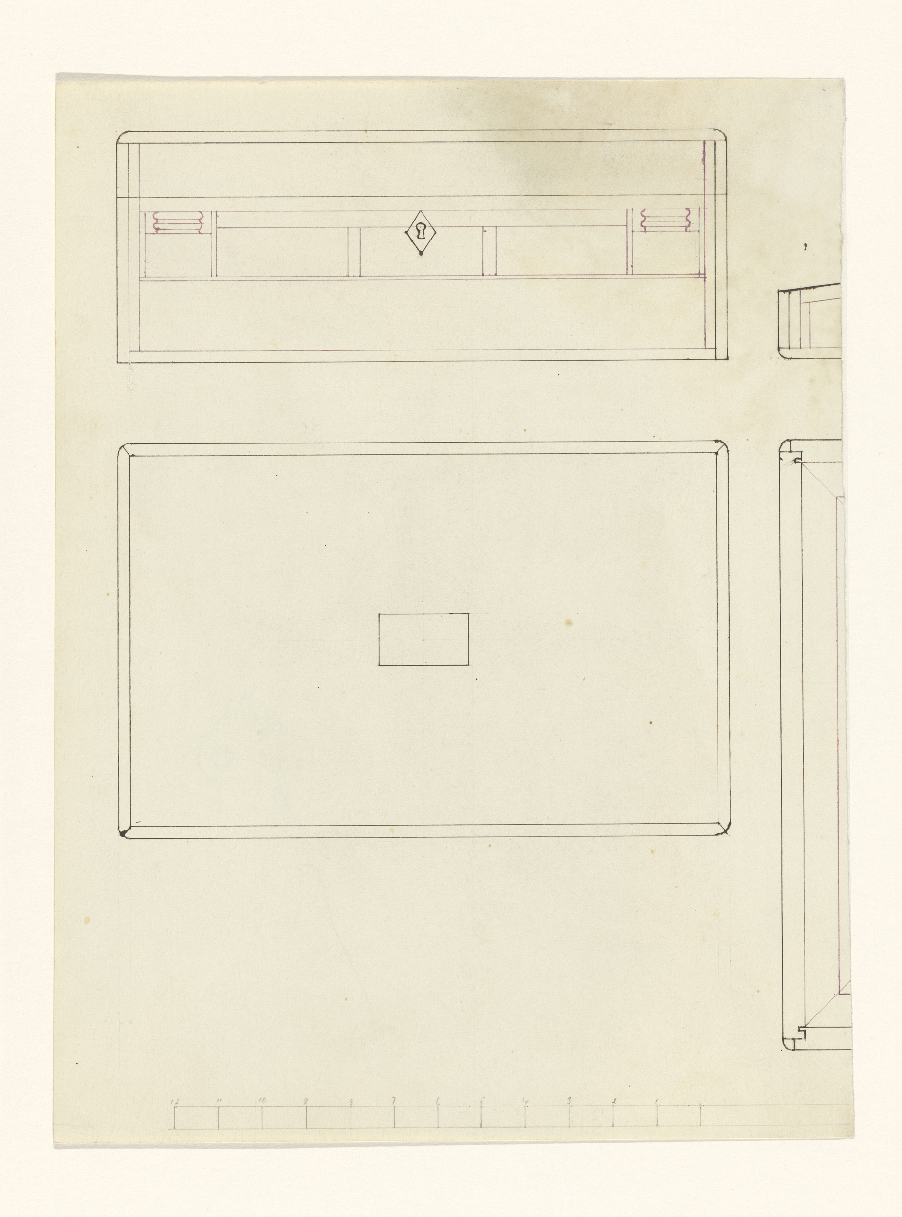 Ontwerp voor een schrijfdoos, voor- en bovenaanzicht...