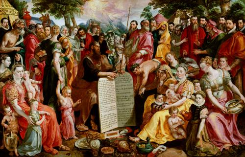 Mozes toont de tafelen der wet aan de Israëlieten, m...