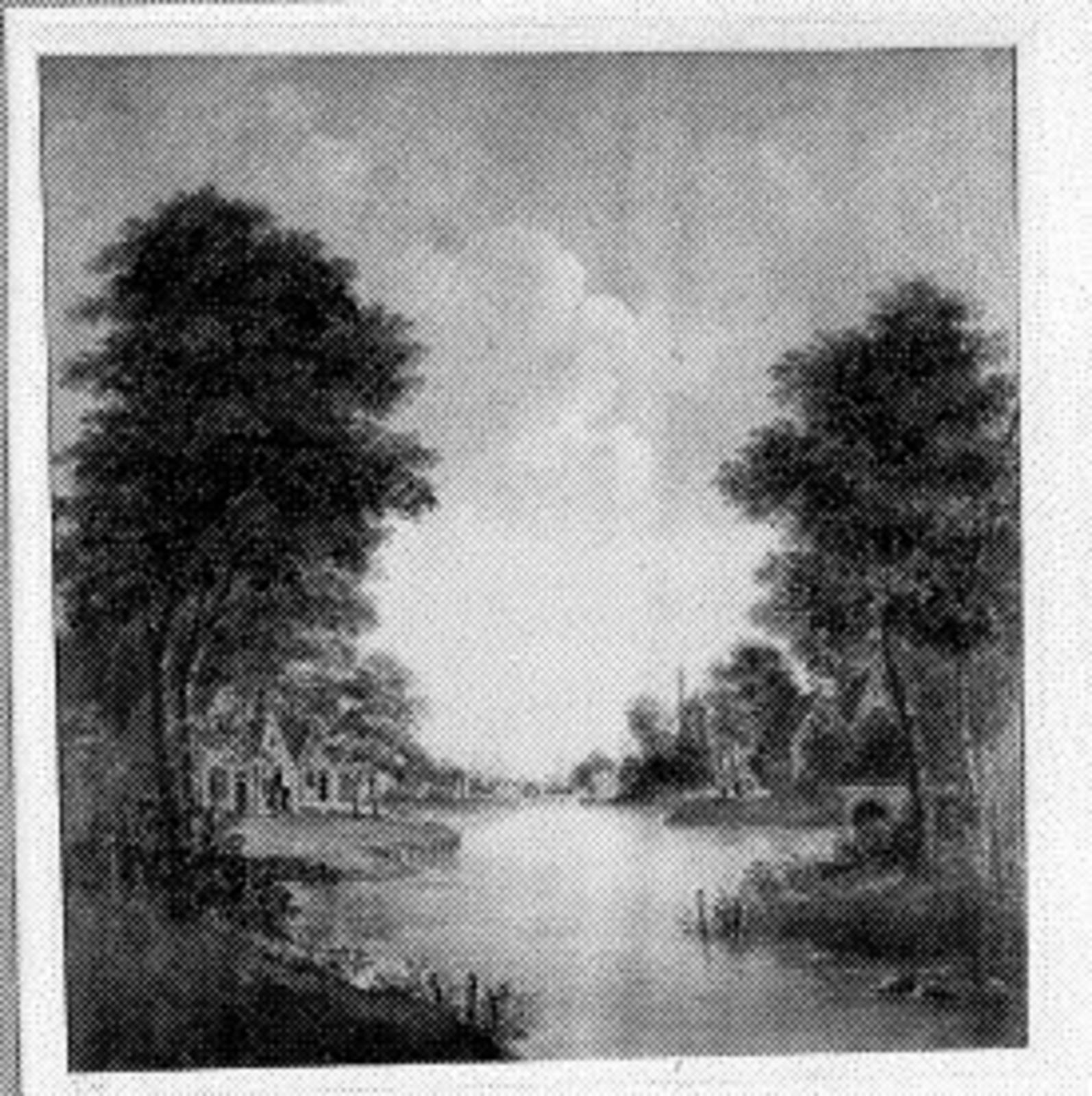 Rivierlandschap in medaillon, gevat in festoen van b...