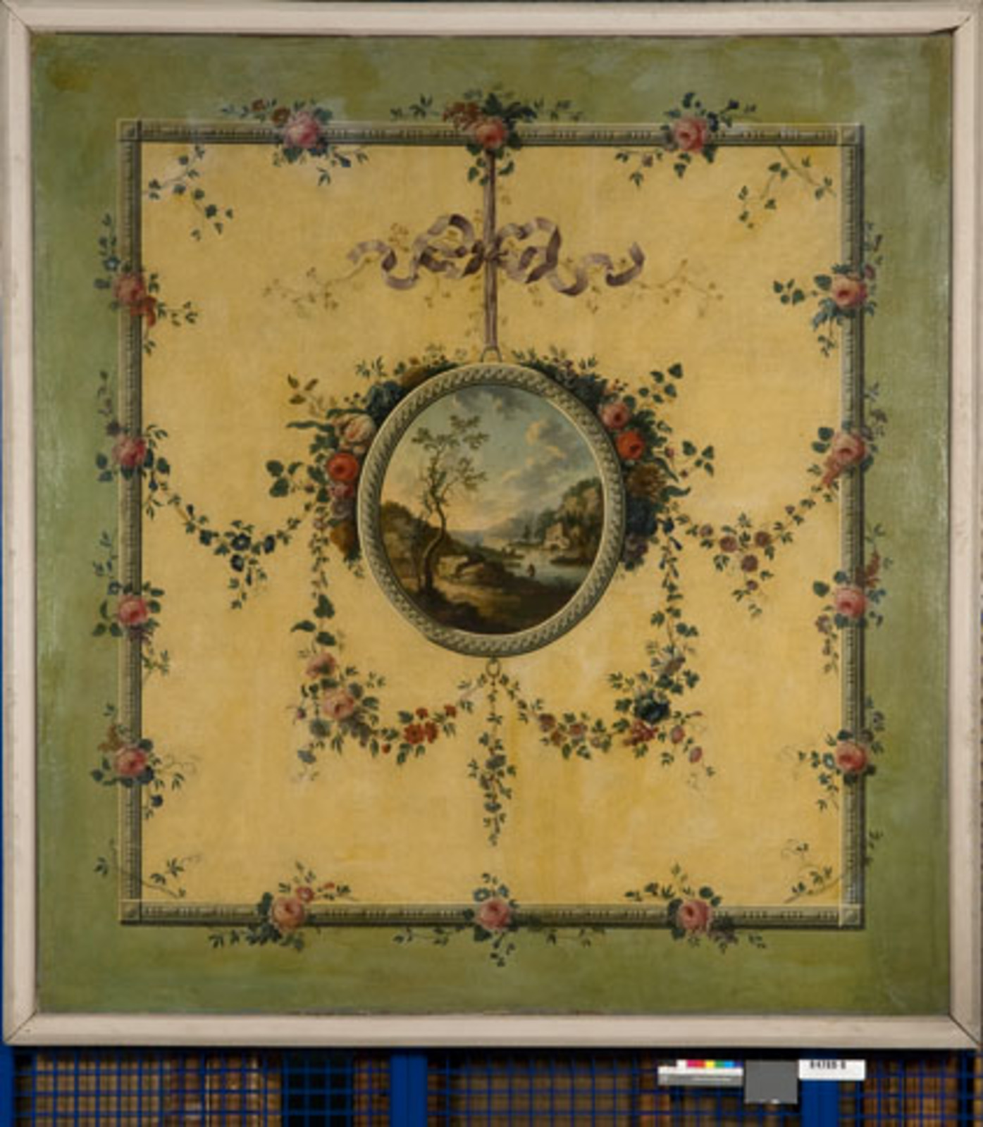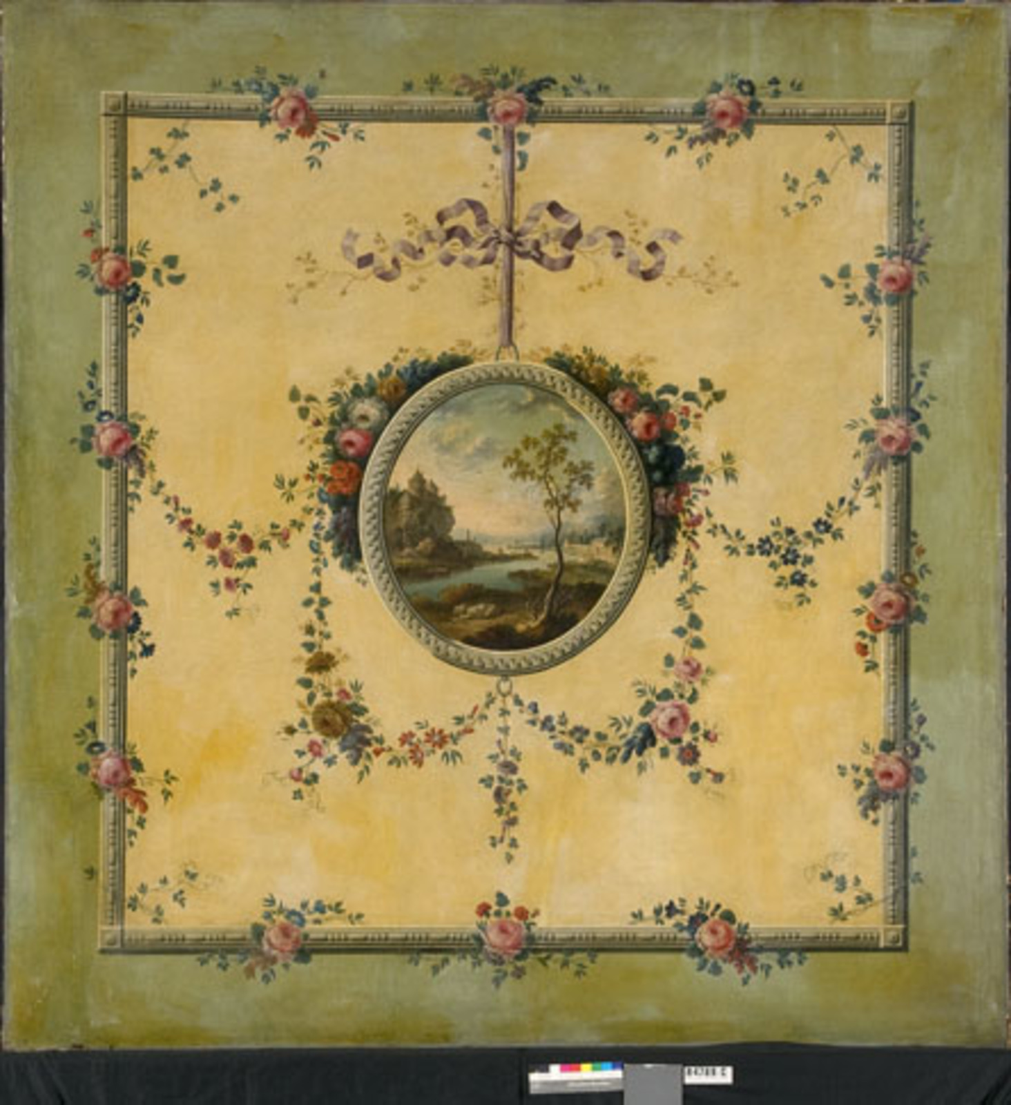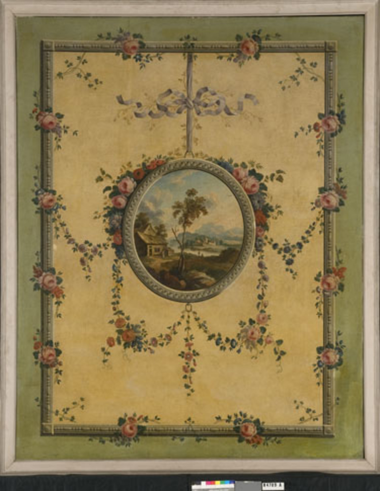 Rivierlandschap in medaillon, gevat in festoen met b...