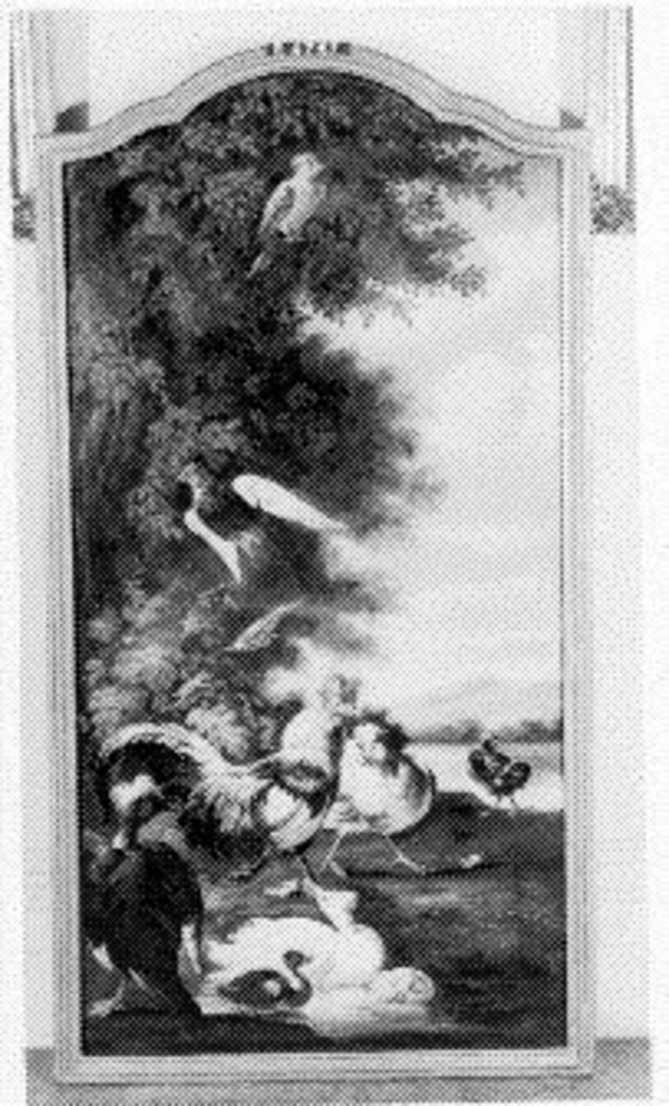 Een haan, eenden en andere vogels in een landschap