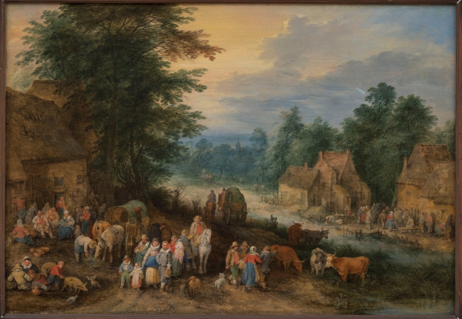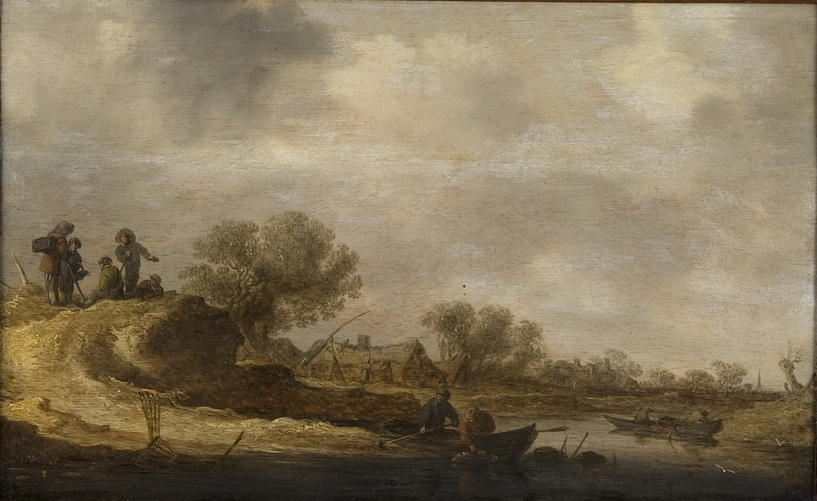 Landschap met rustende reizigers op heuvel bij rivier