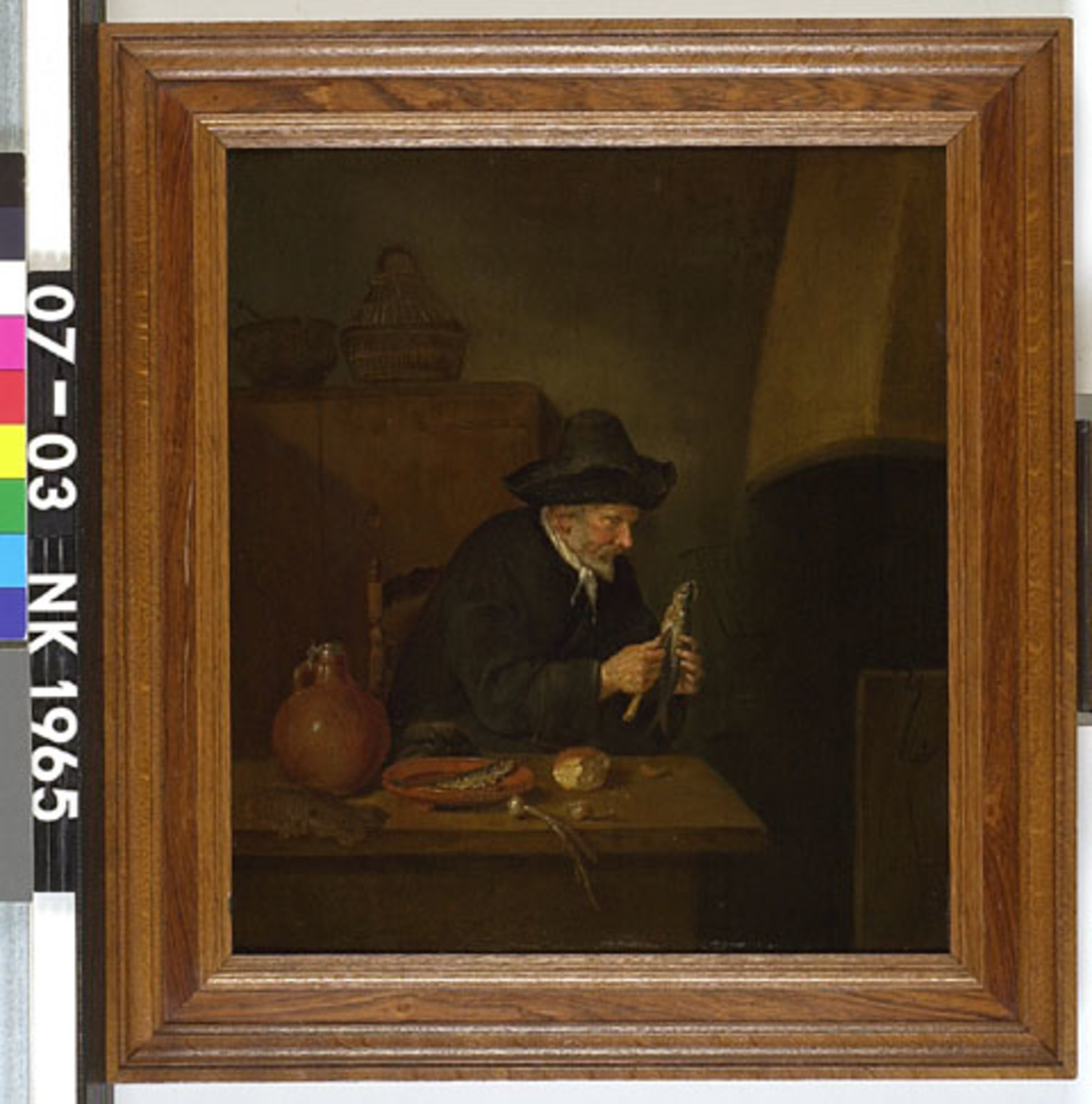 Oude man, een haring schoonmakend