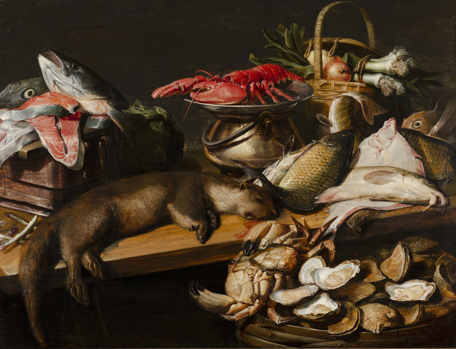 Stilleven met vis, groenten en een bever