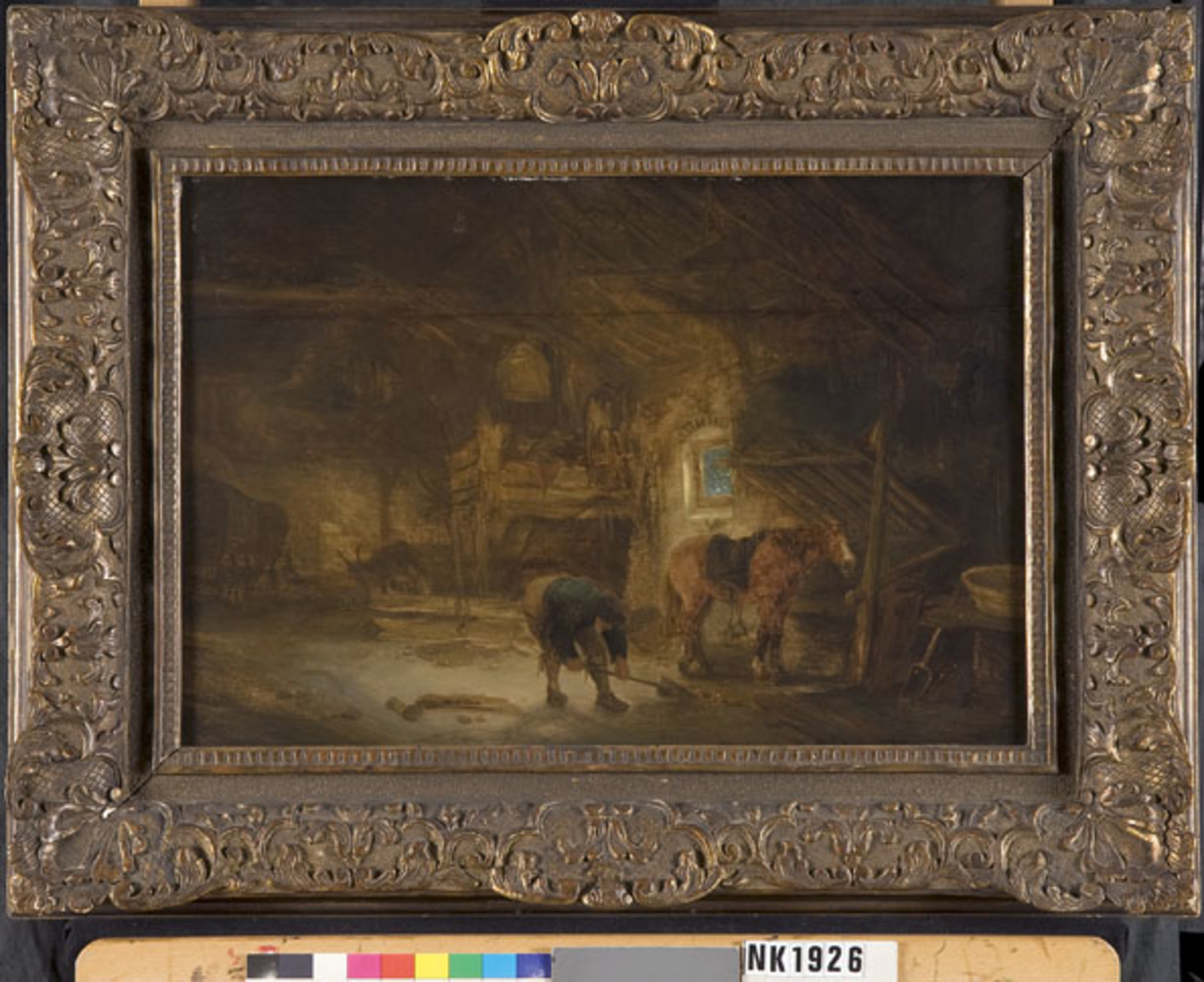 Interieur van een stal met een boer en een paard