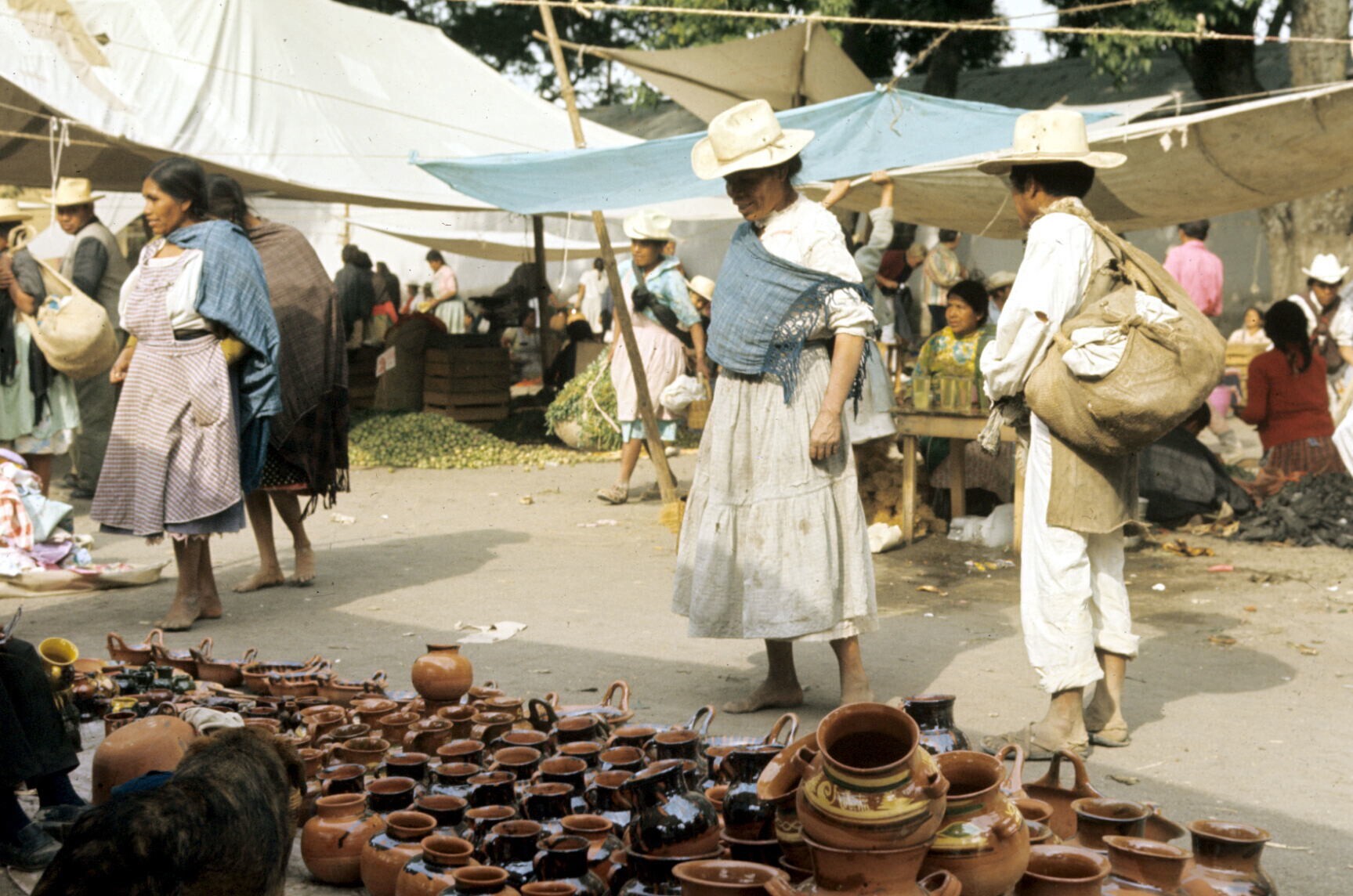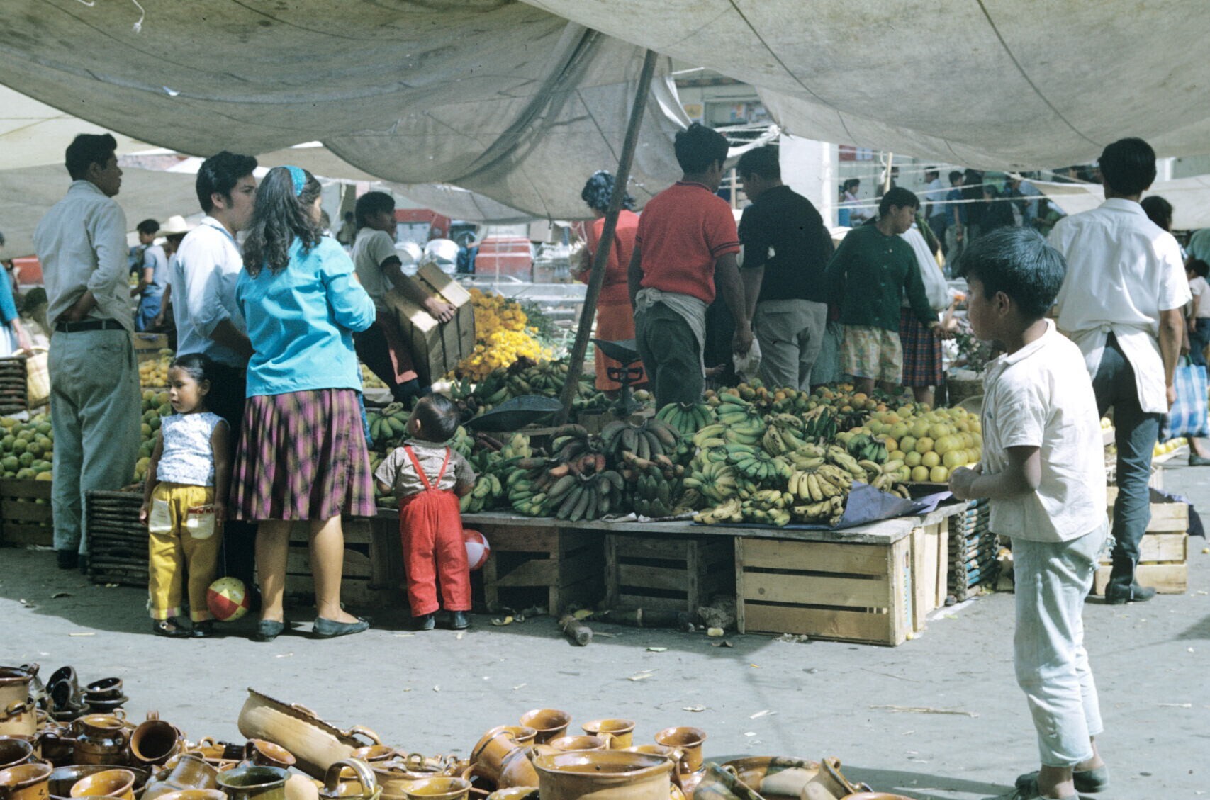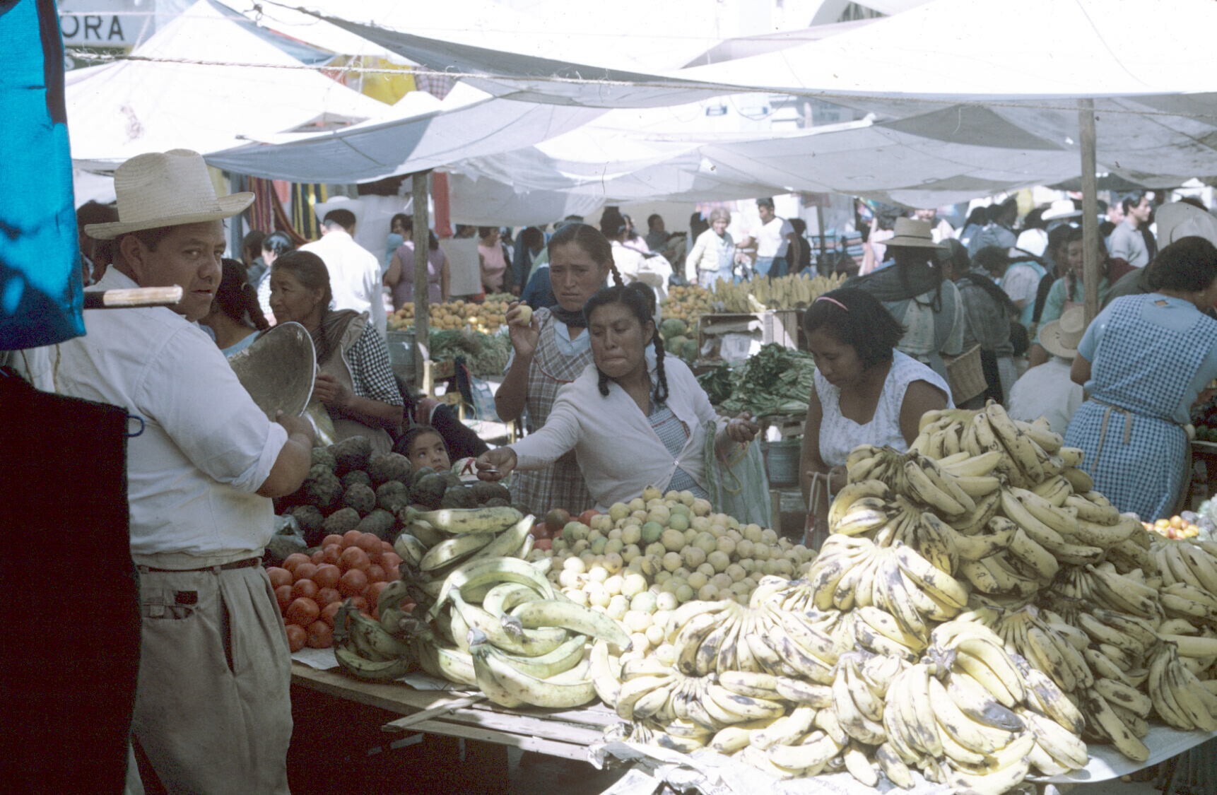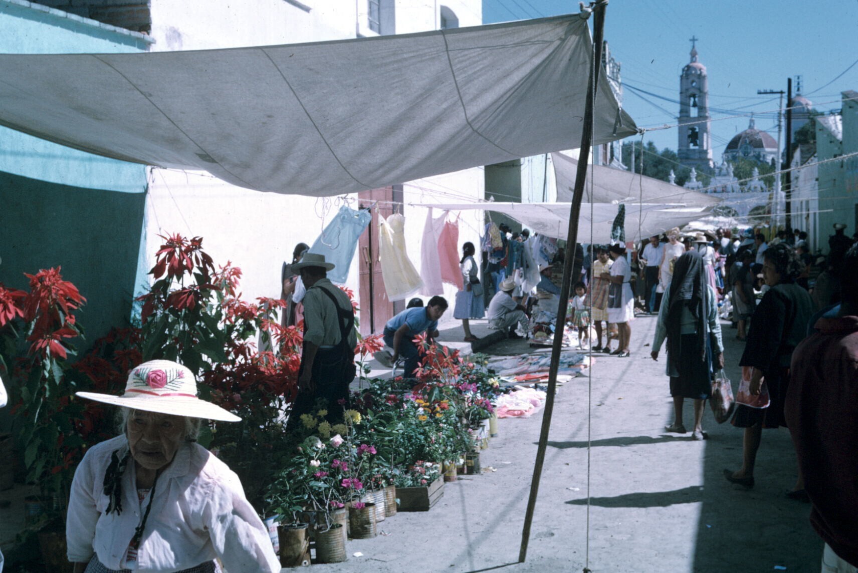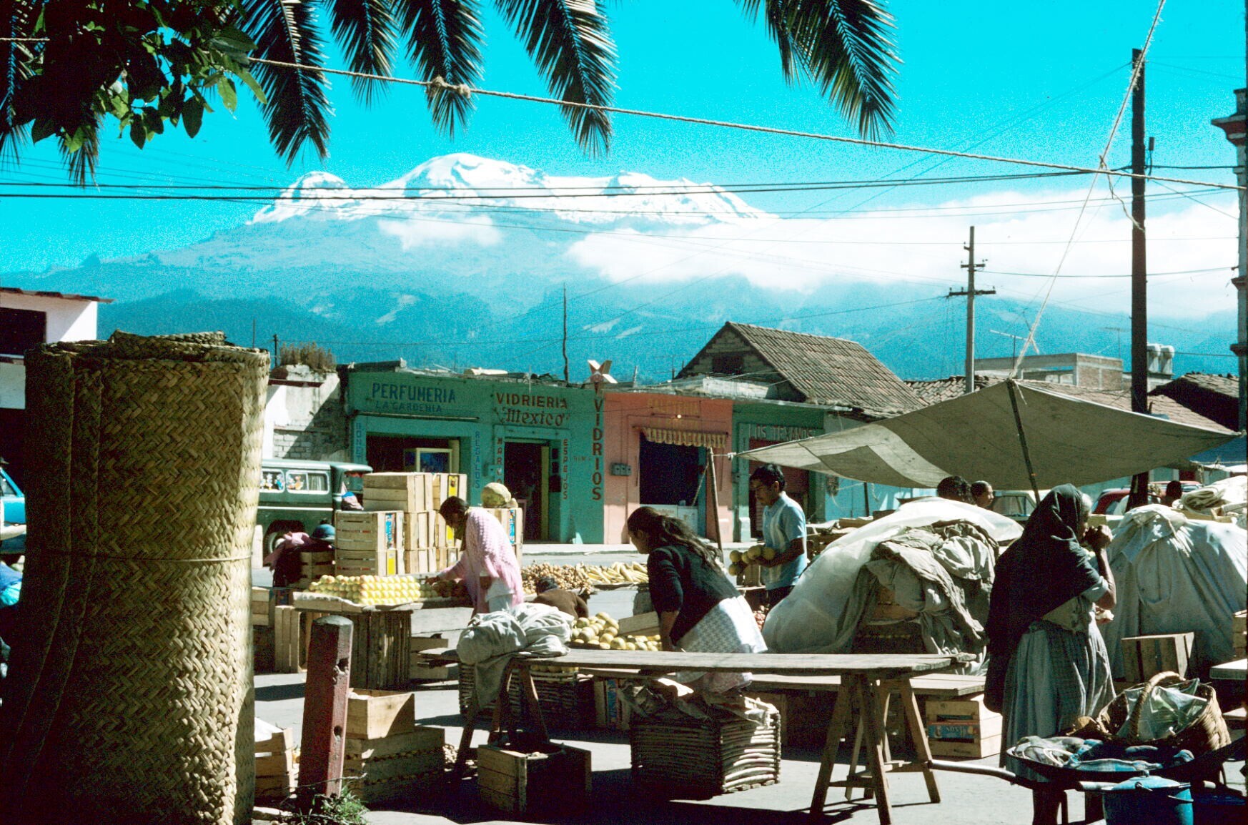 markt; op achtergrond de vulkaan Iztaccihuatl