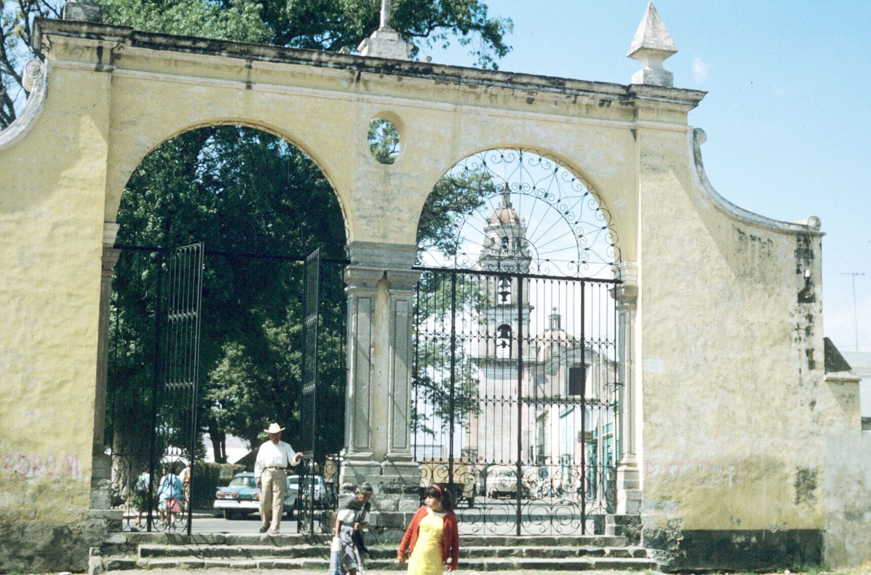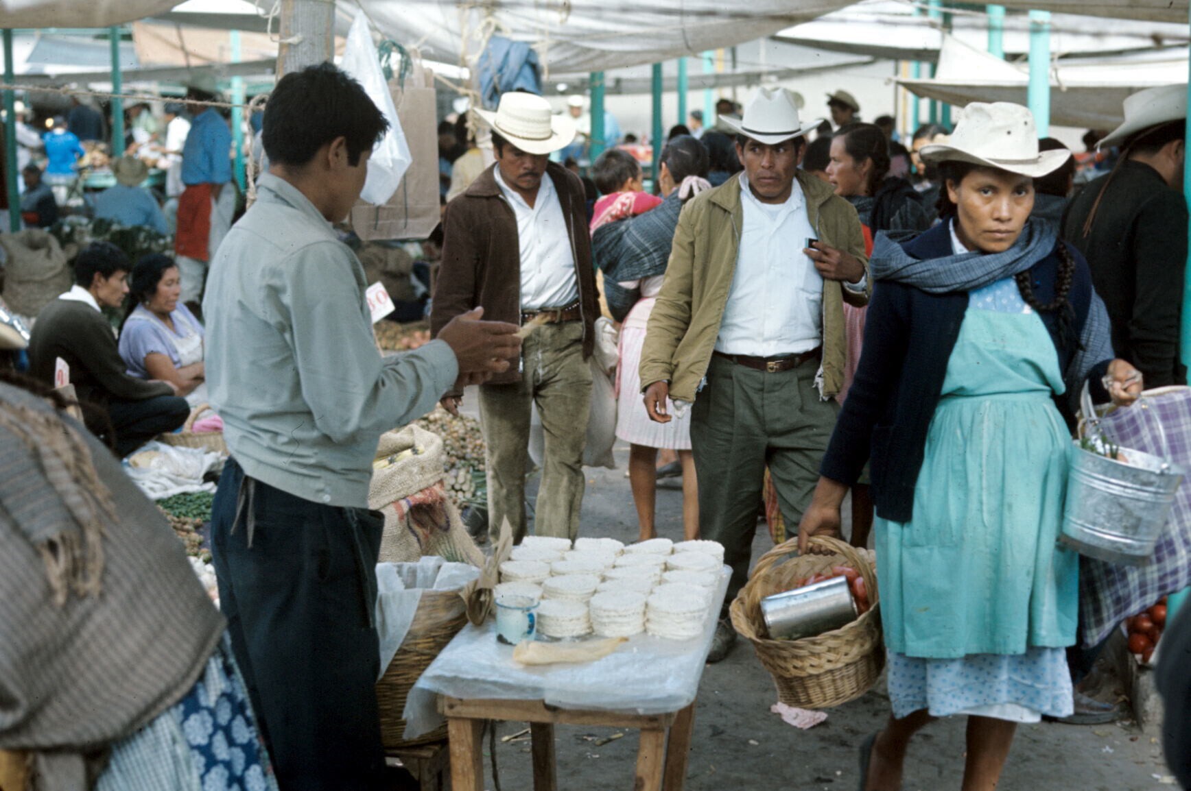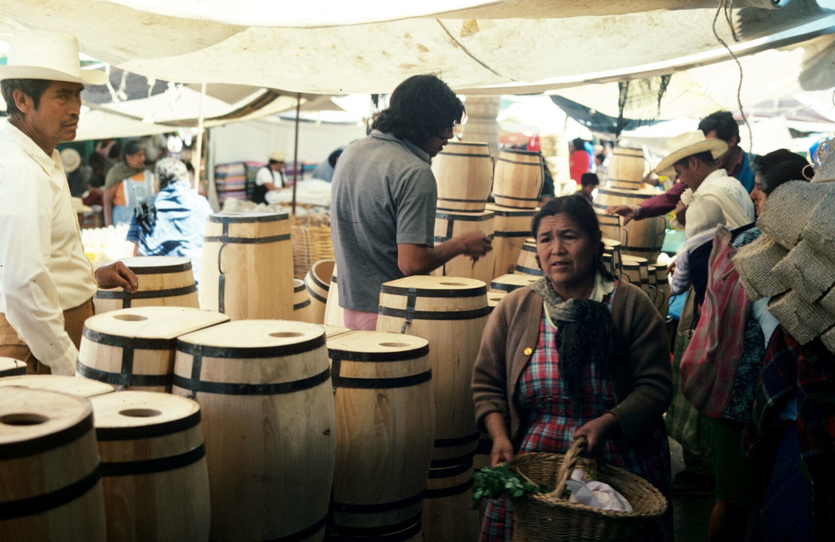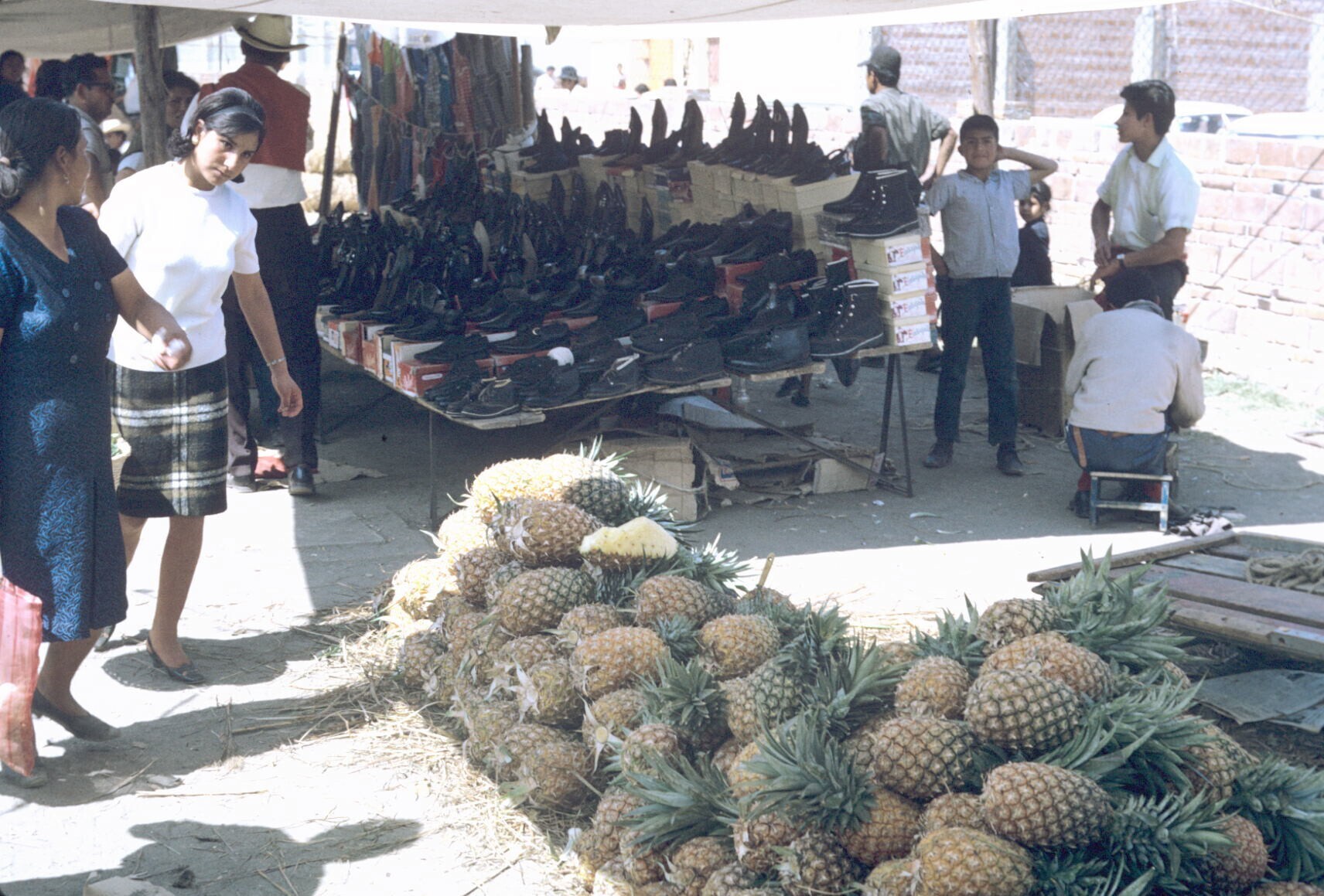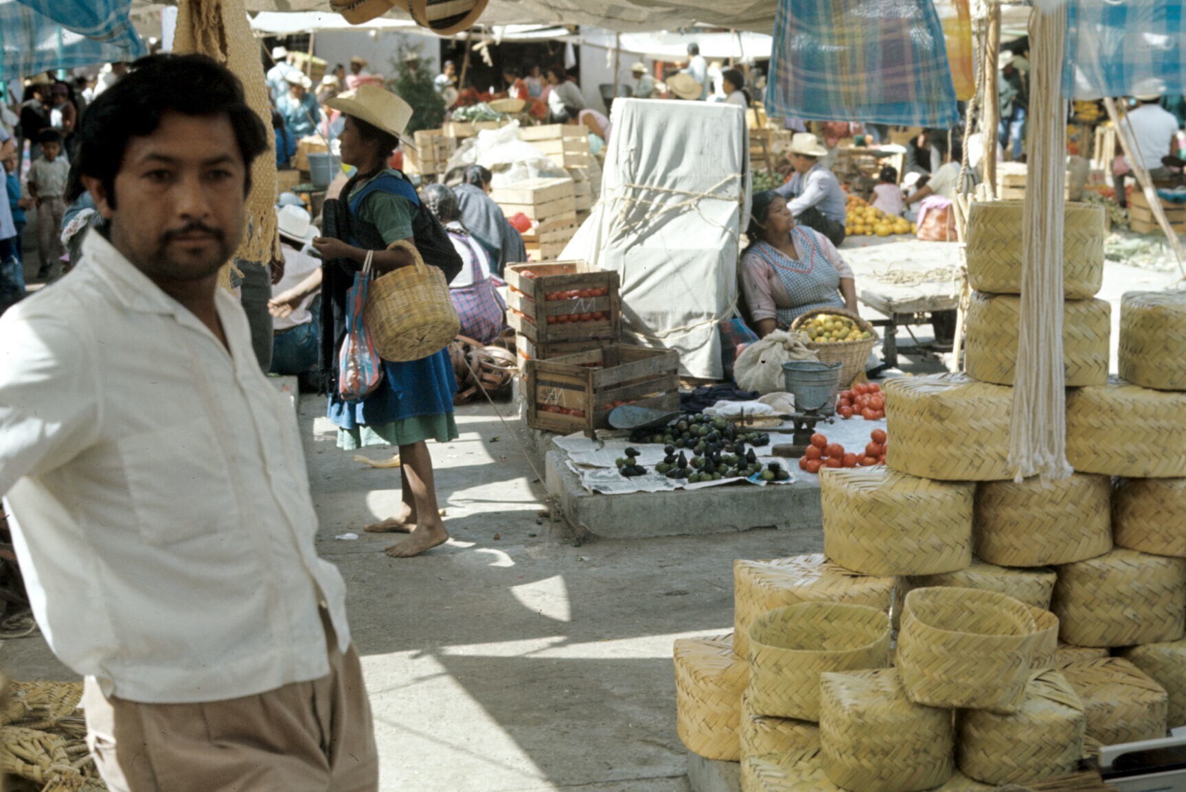 markt; op achtergrond de vulkaan Iztaccihuatl