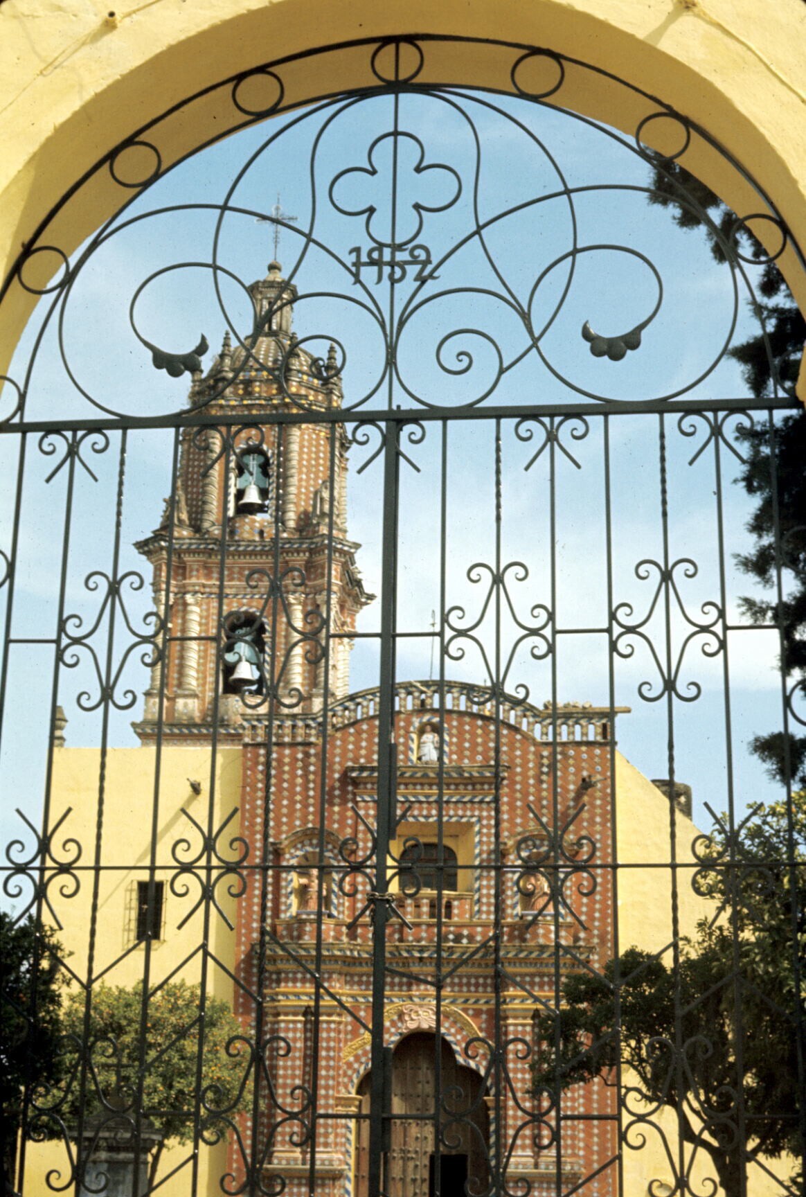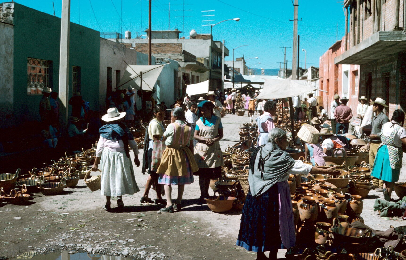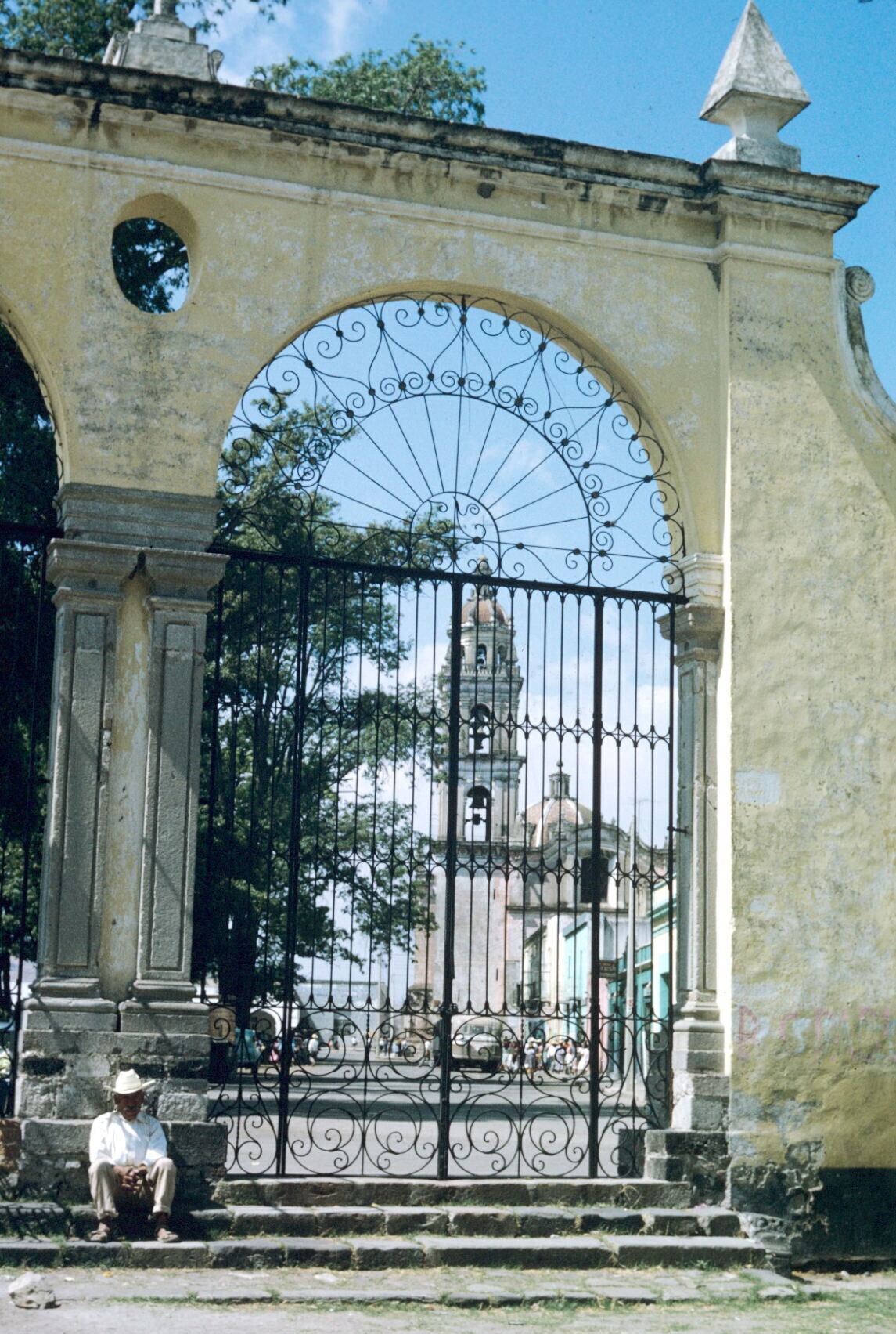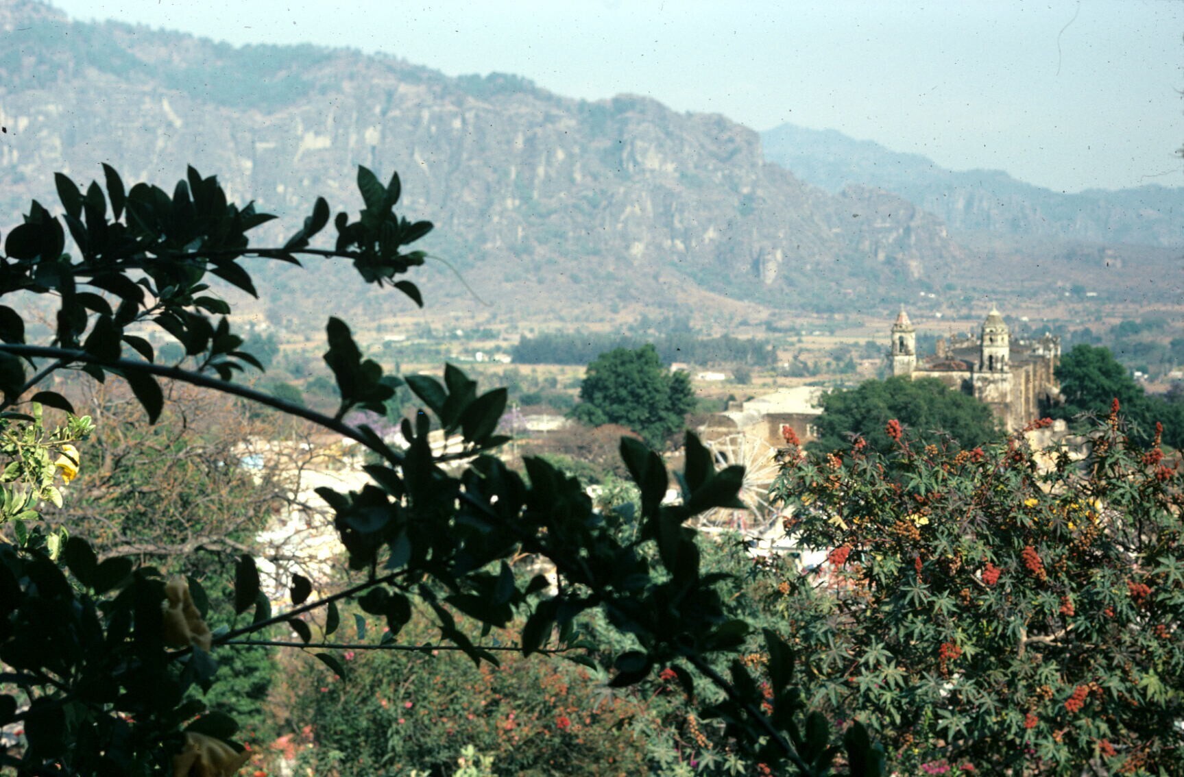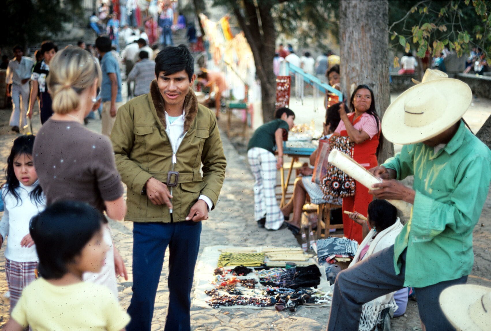 markt; op achtergrond de vulkaan Iztaccihuatl