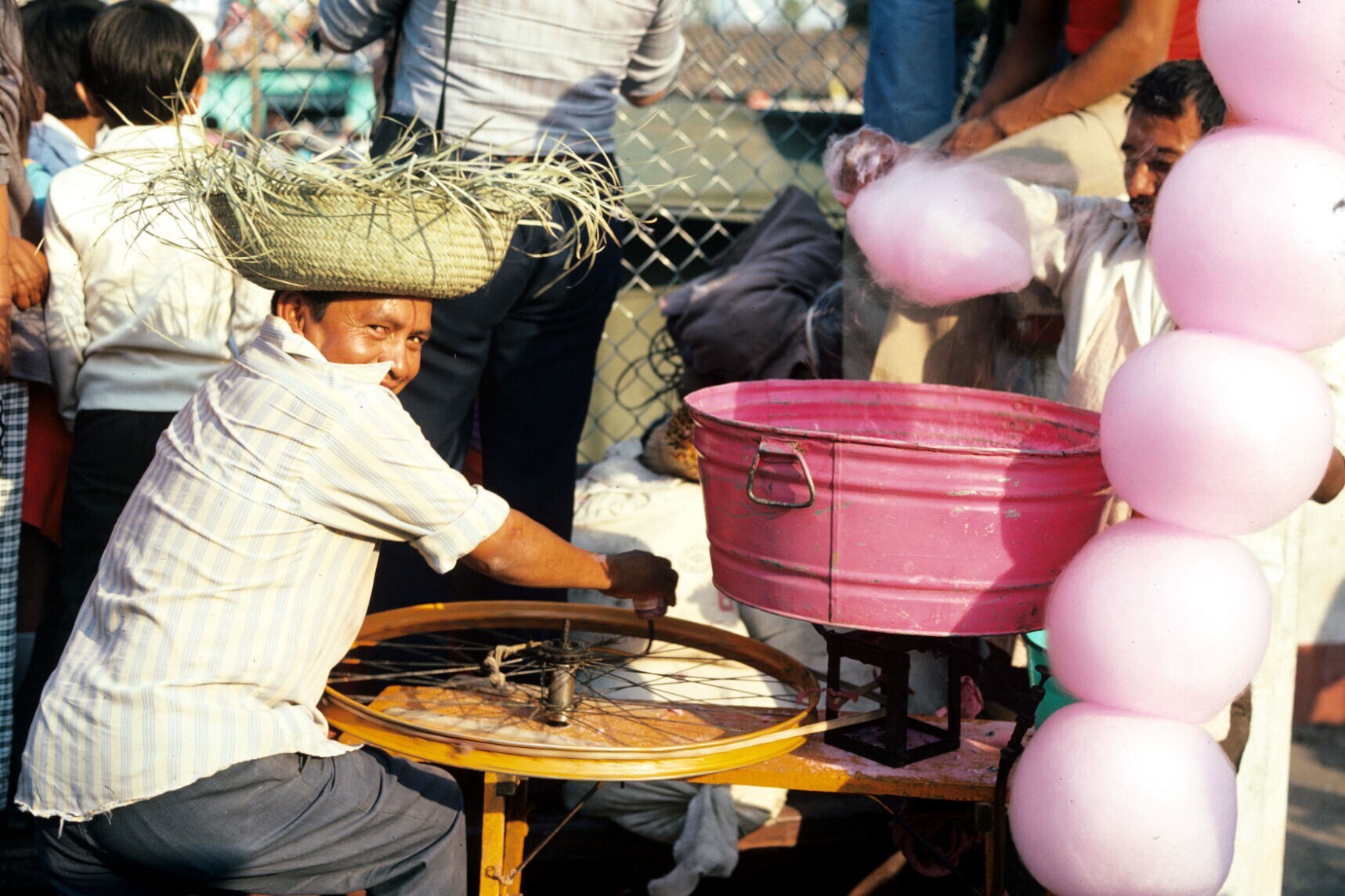 suikerspinmachine, aangedreven met fietswiel, op "fe...