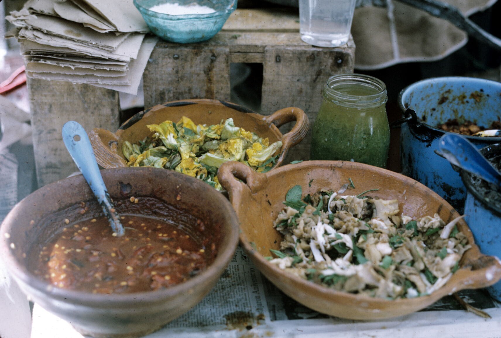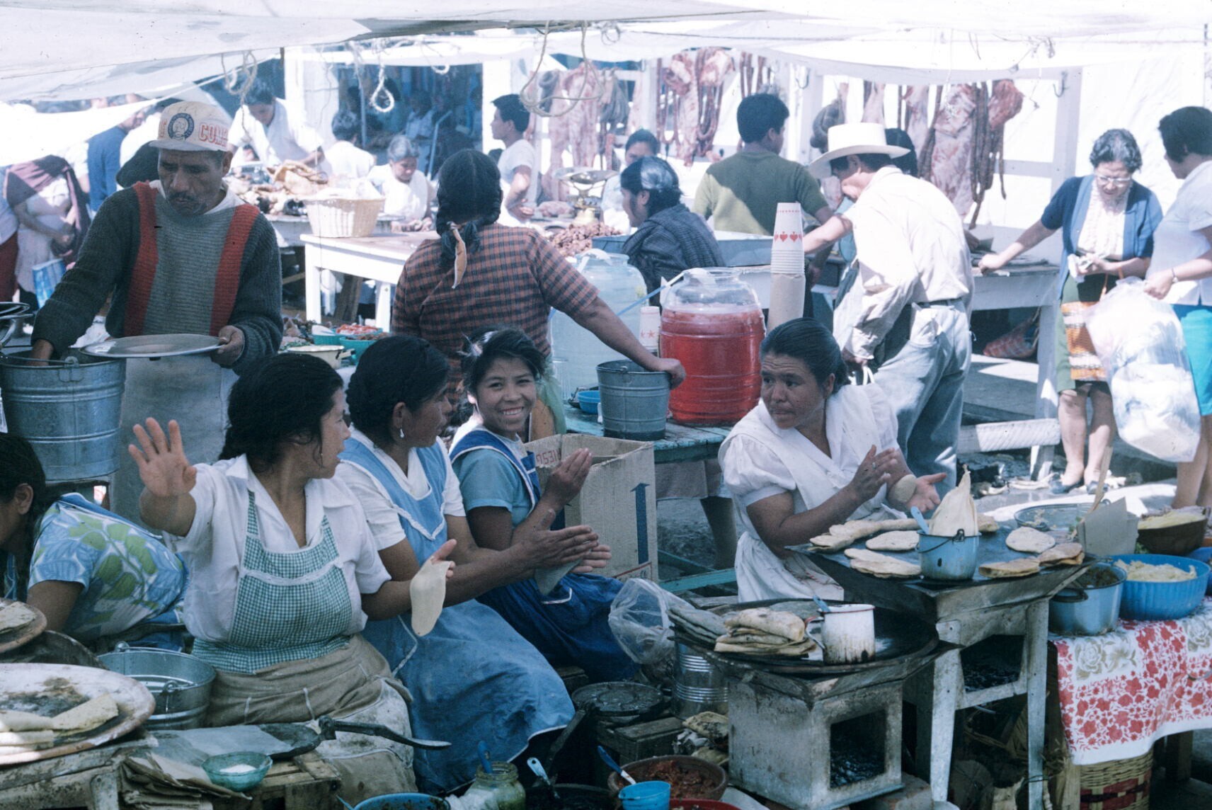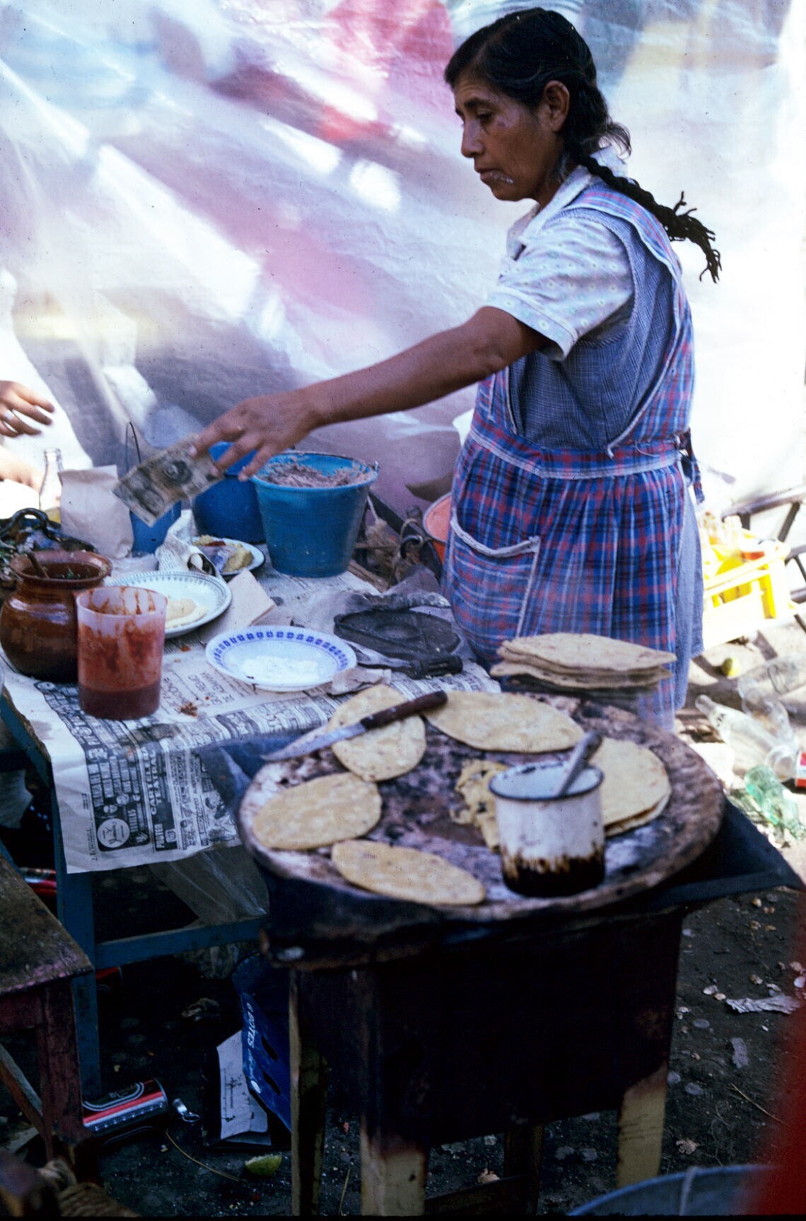 tortillaverkoopster bij comal (bakplaat), bonen op t...