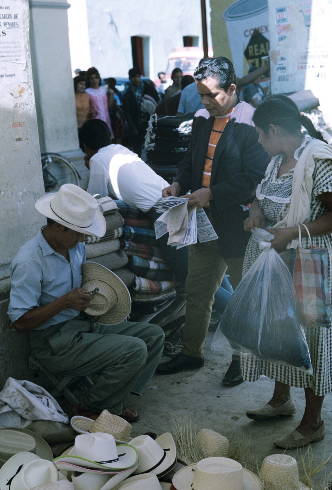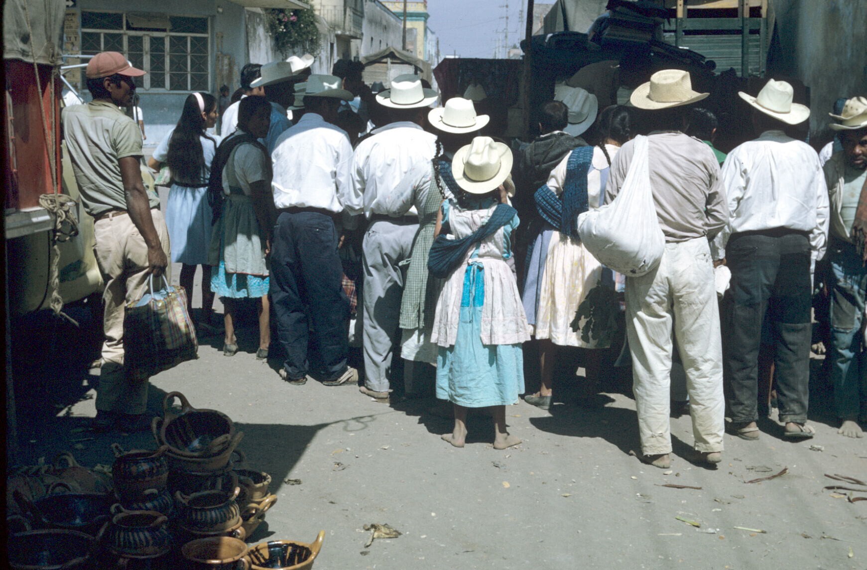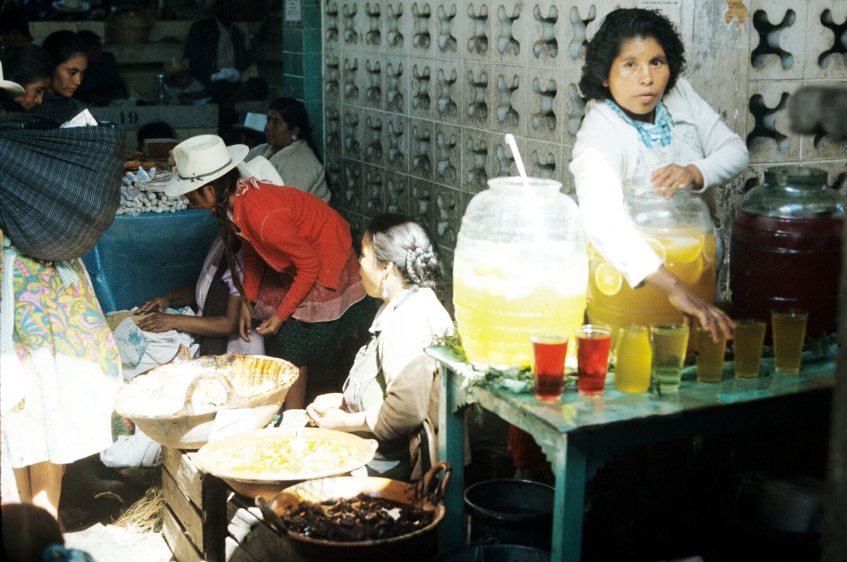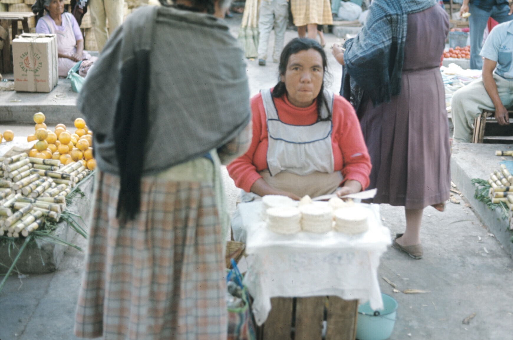 tortillaverkoopster bij comal (bakplaat), bonen op t...