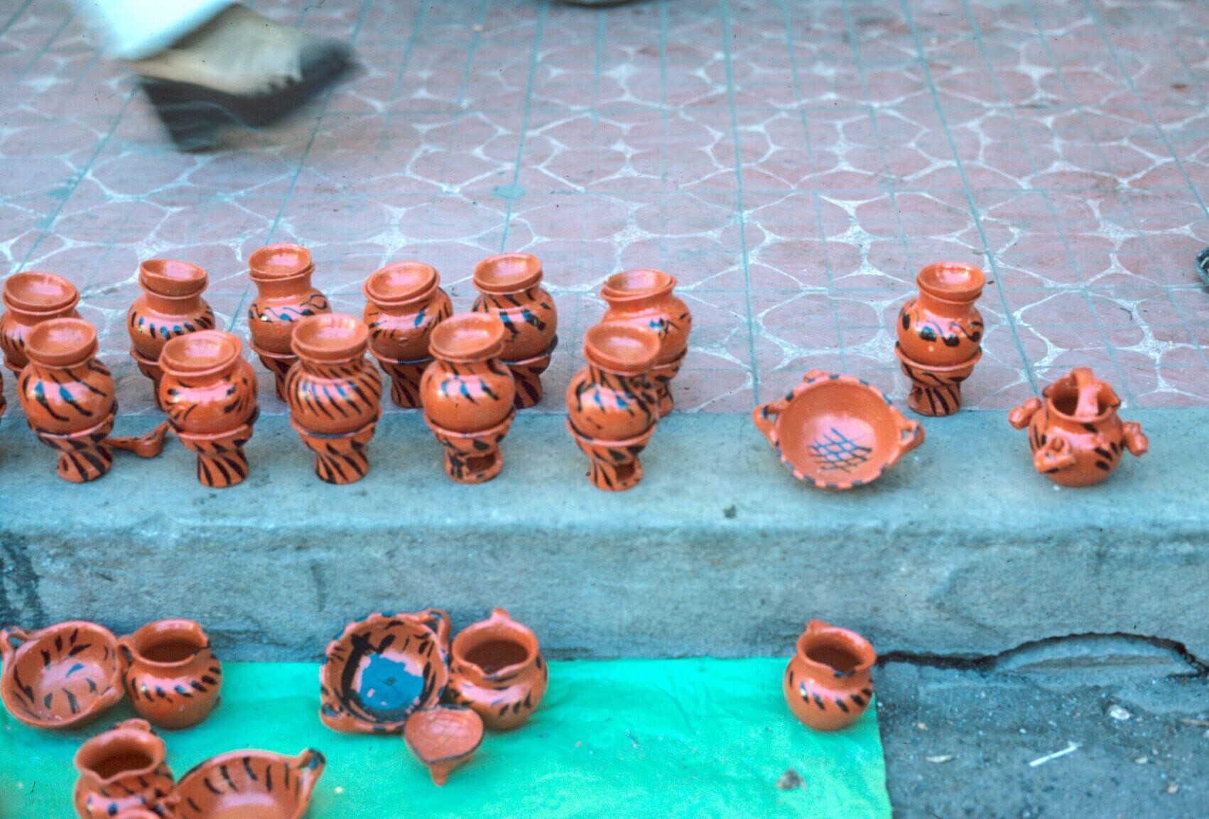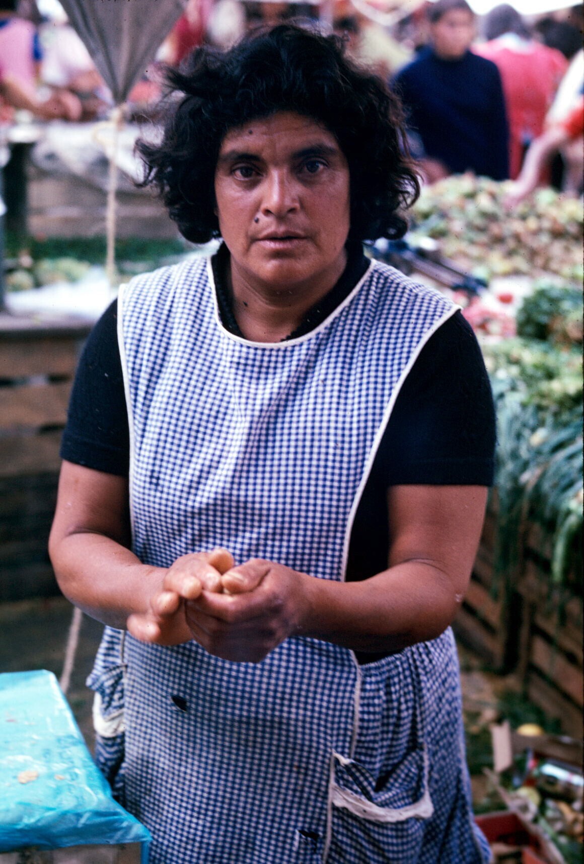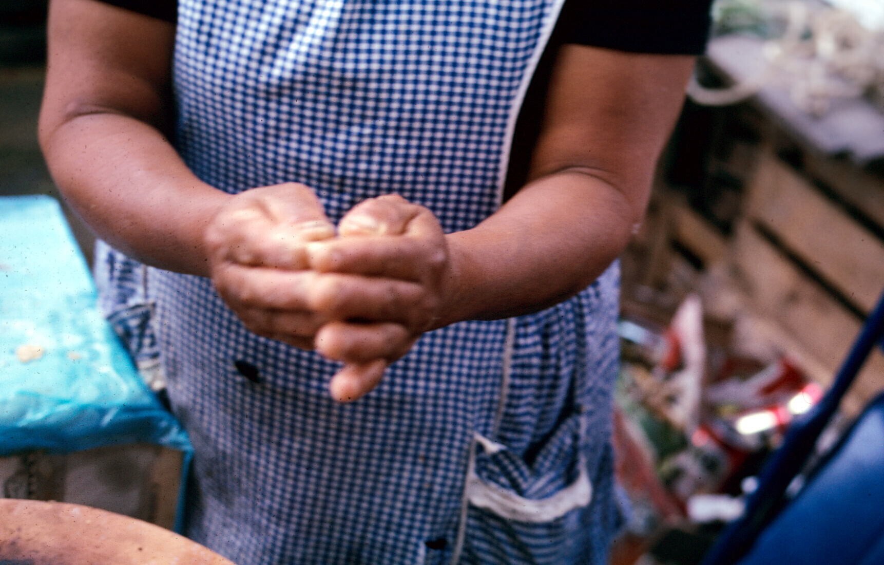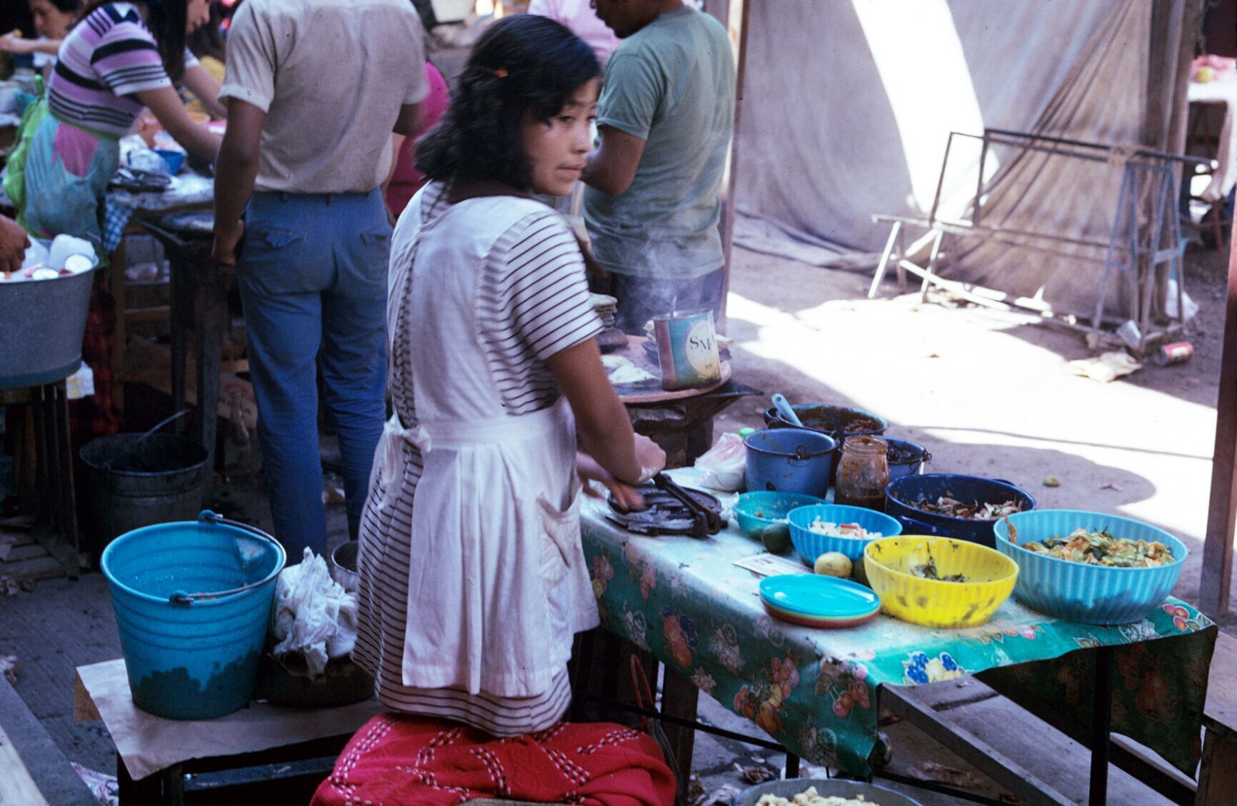tortillaverkoopster in stalletje, met comal (bakplaat)