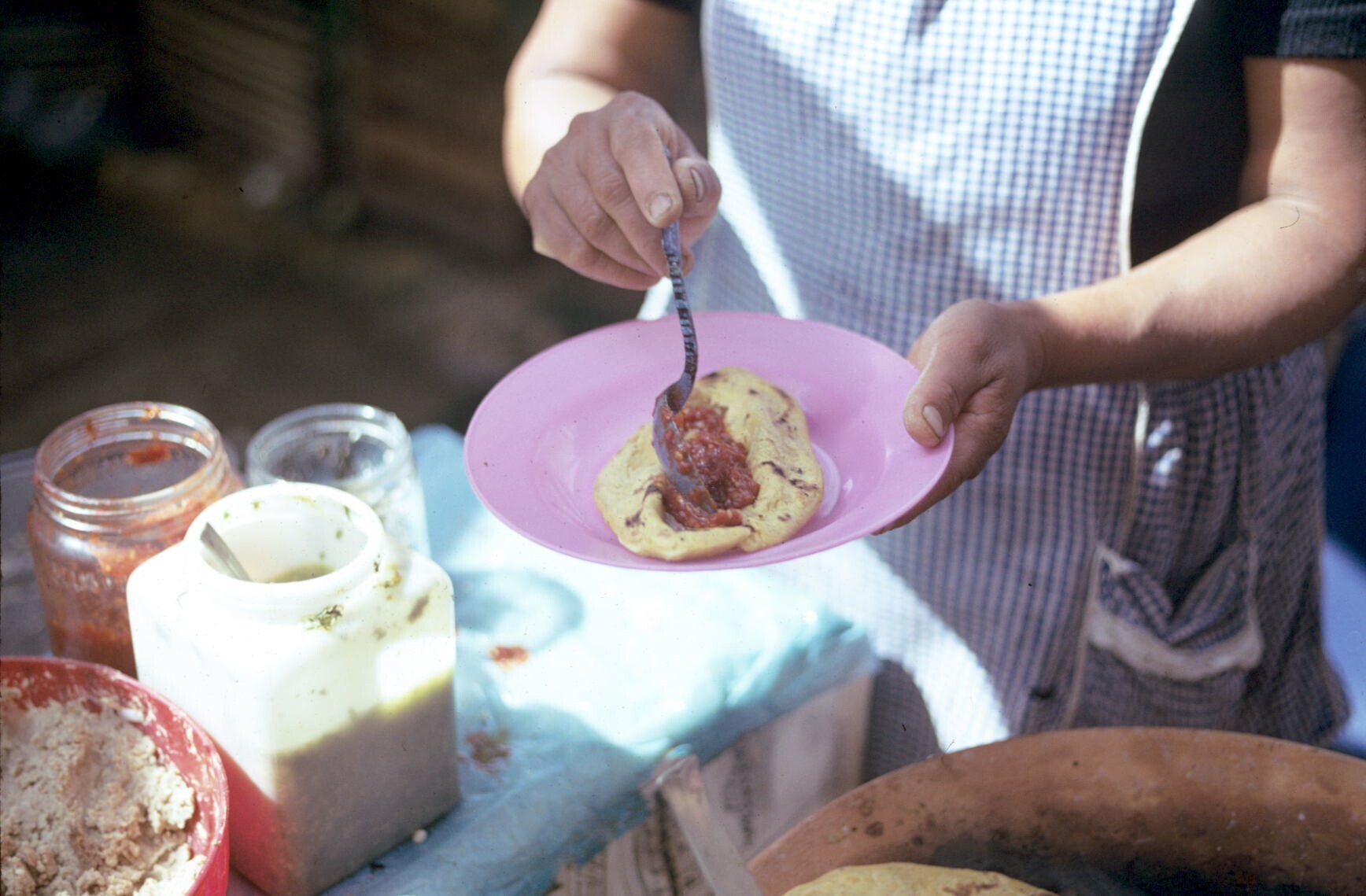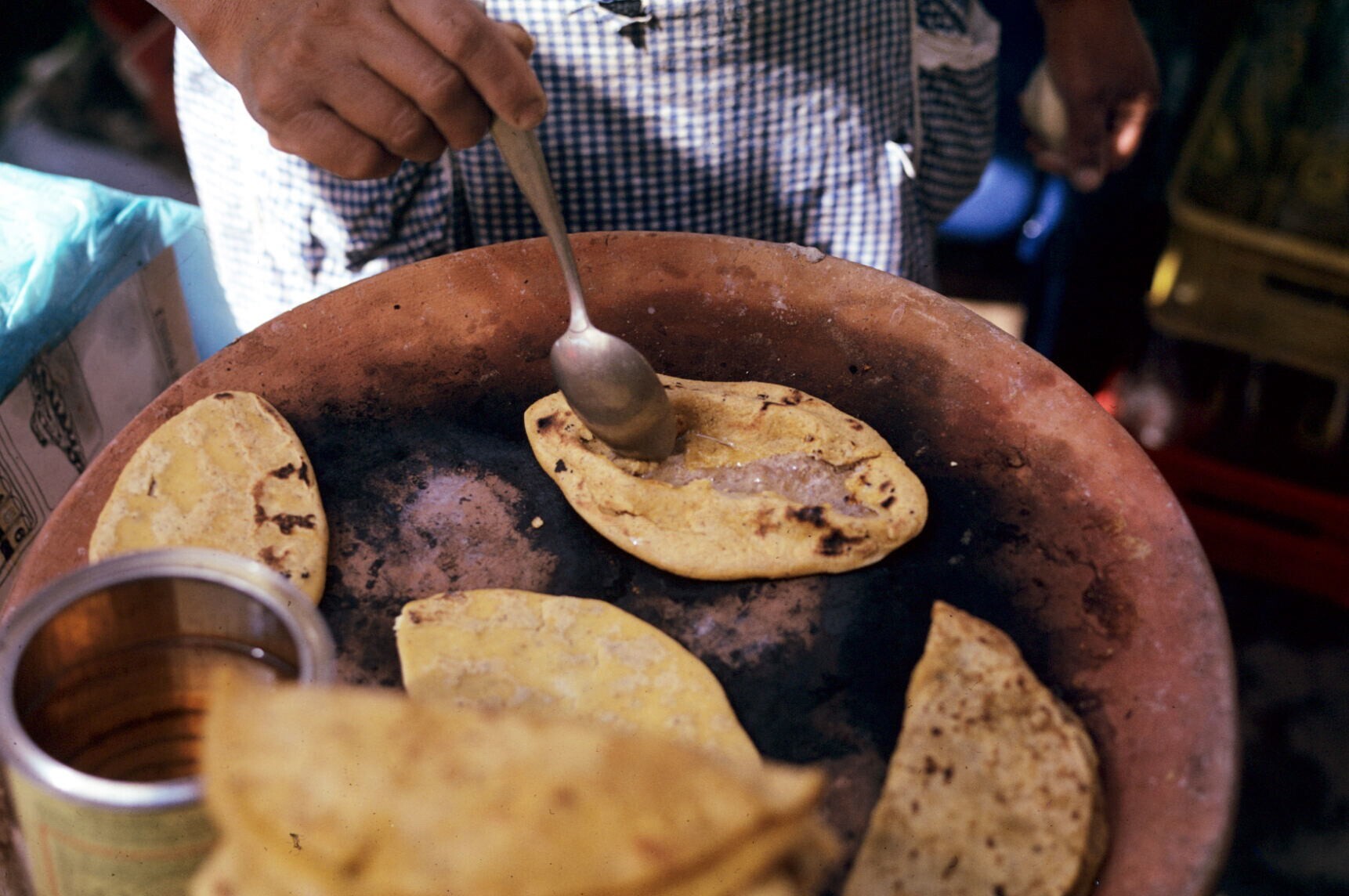 tortillaverkoopster, mole (saus) op tortilla's schep...