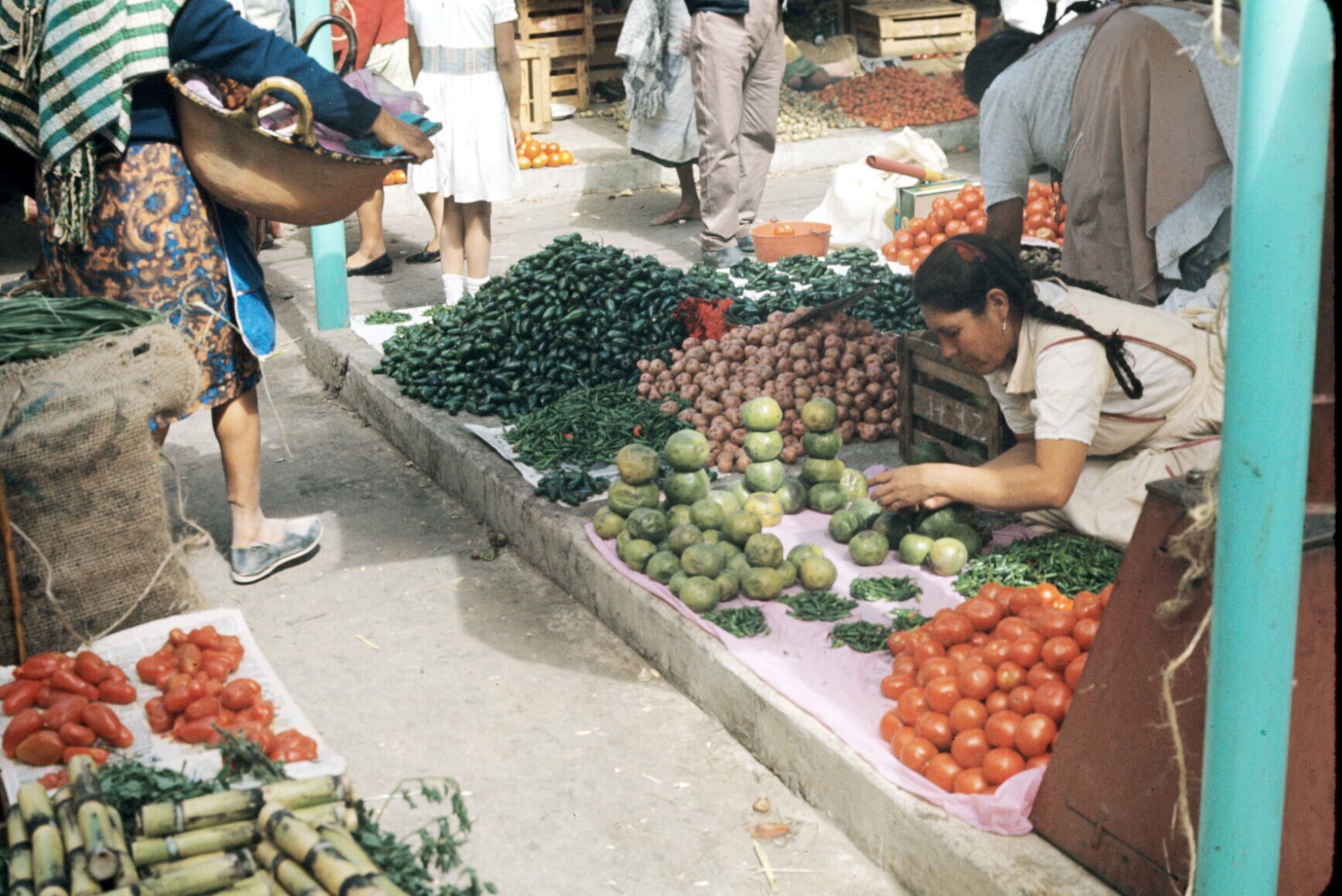 chiles (Spaanse pepers), knoflook en fruit op markt
