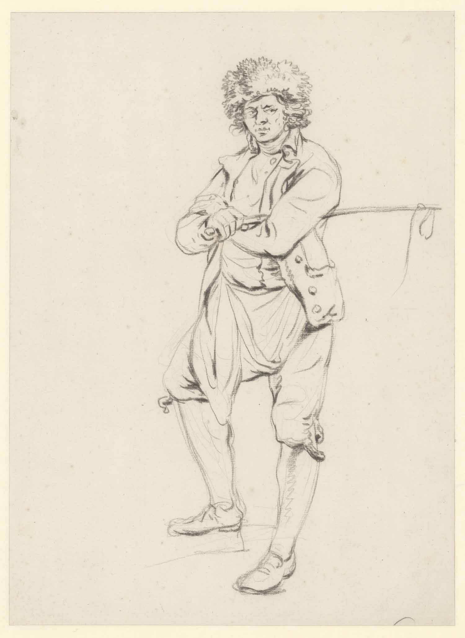 Staande postiljon met bontmuts en zweep