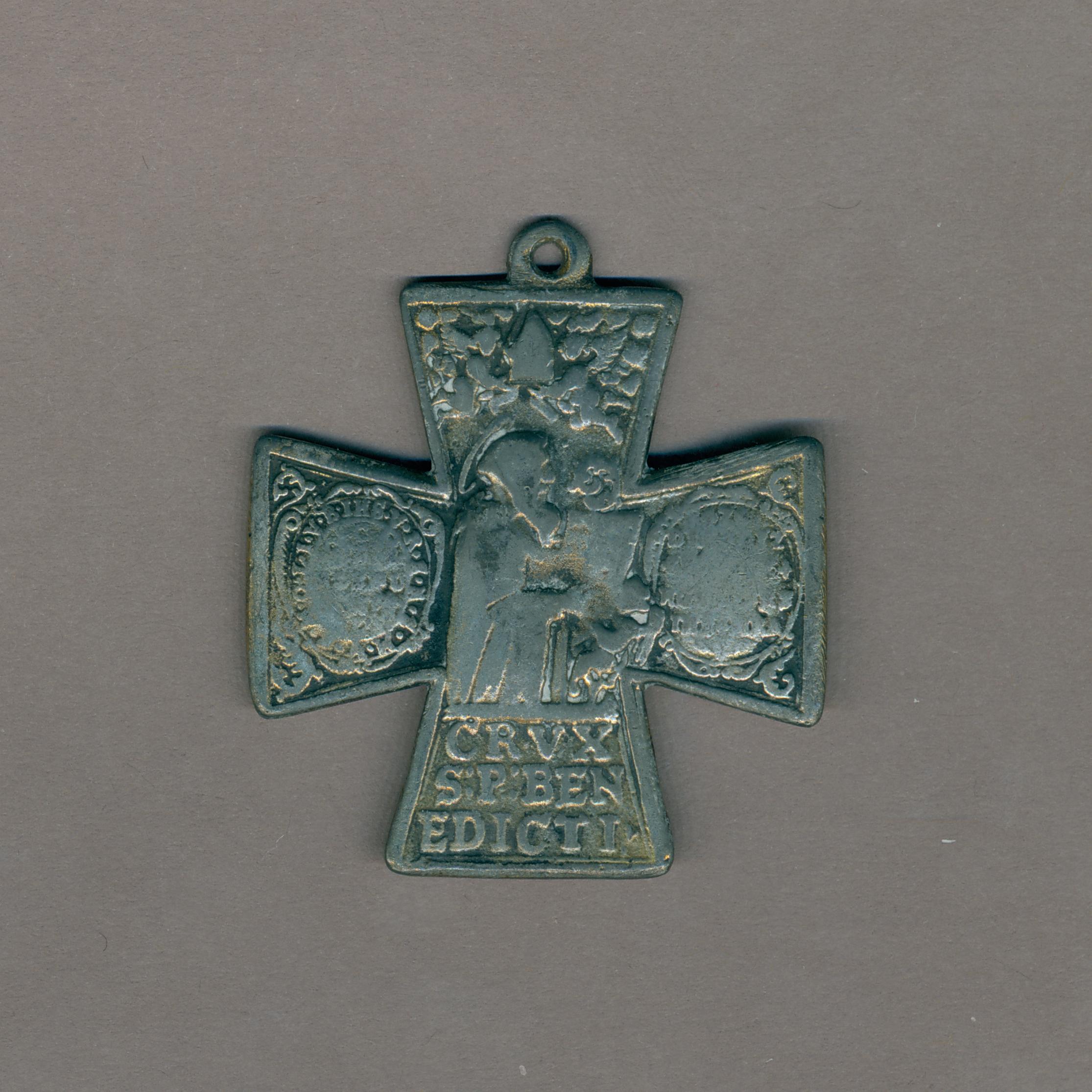 Benedictuspenning in vorm gelijkarmig kruis met Bene...