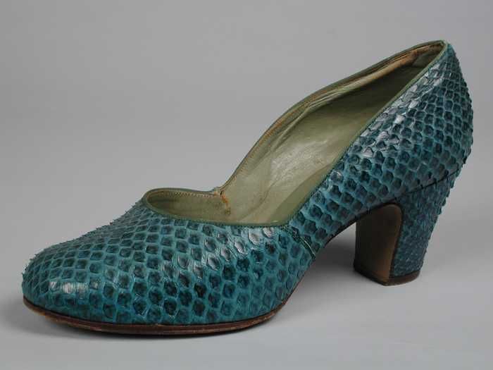 Paar damesschoenen, zeegroene slangenleren pumps met...