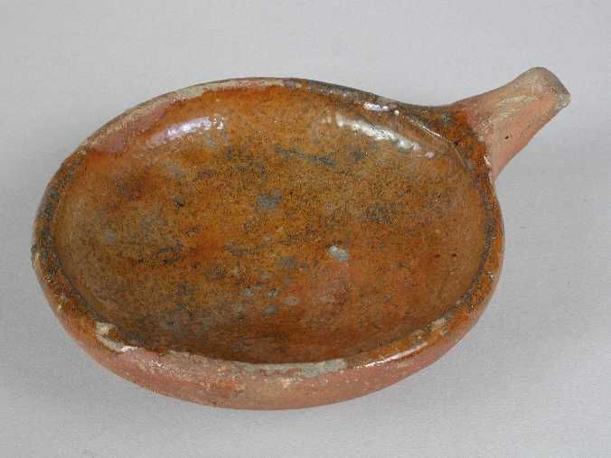 Aardewerk speelgoed braadpan, met handgreep, op stan...