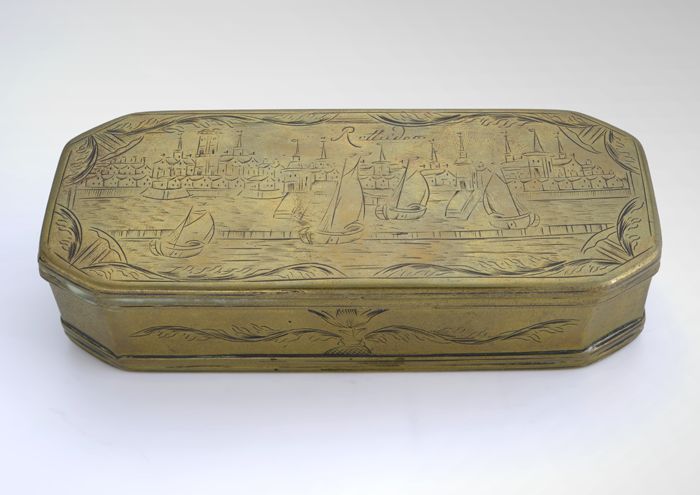 Koperen tabaksdoos met gezicht op Rotterdam, aan de ...