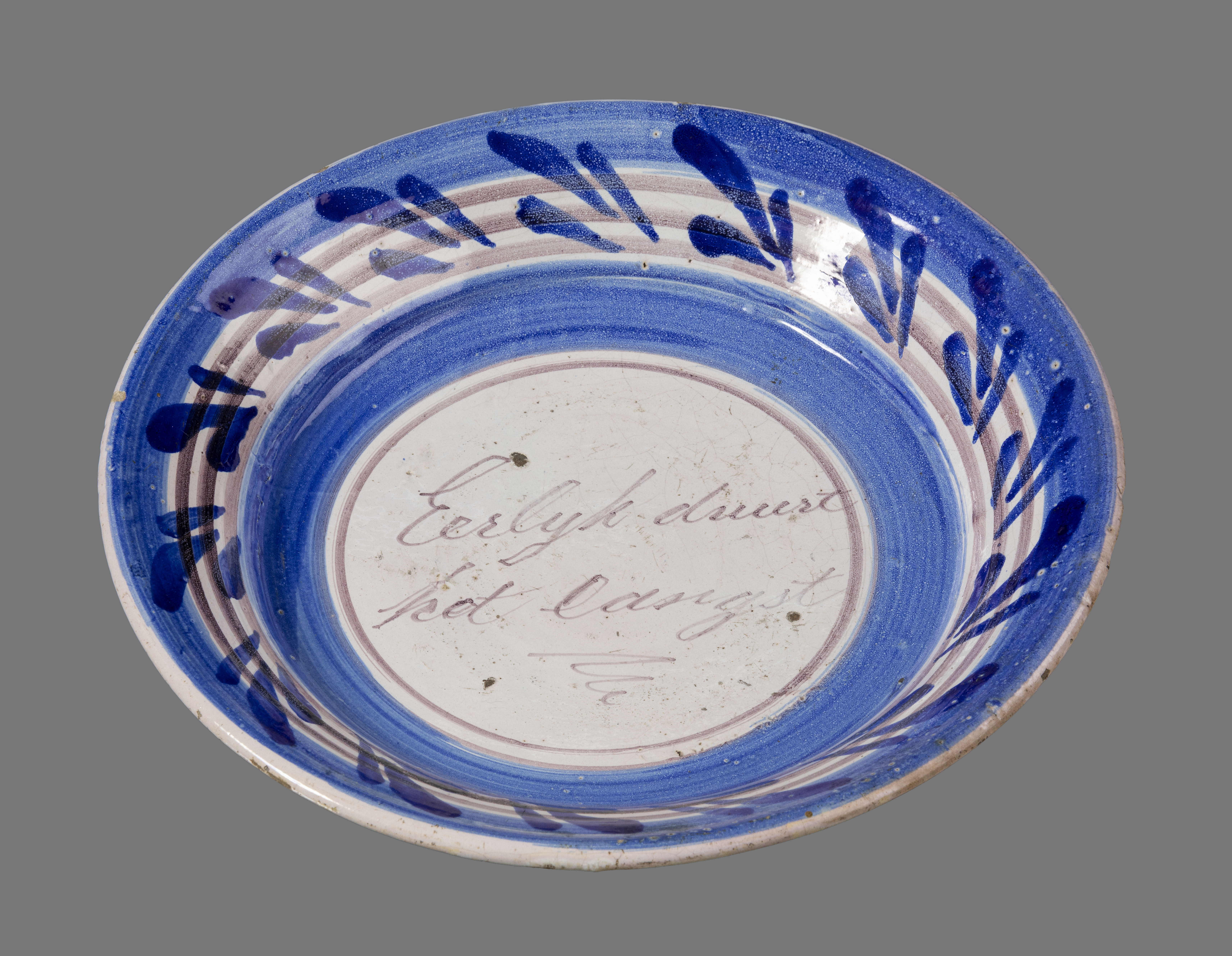 Spreukschotel met blauw en paars decor van opschrift.