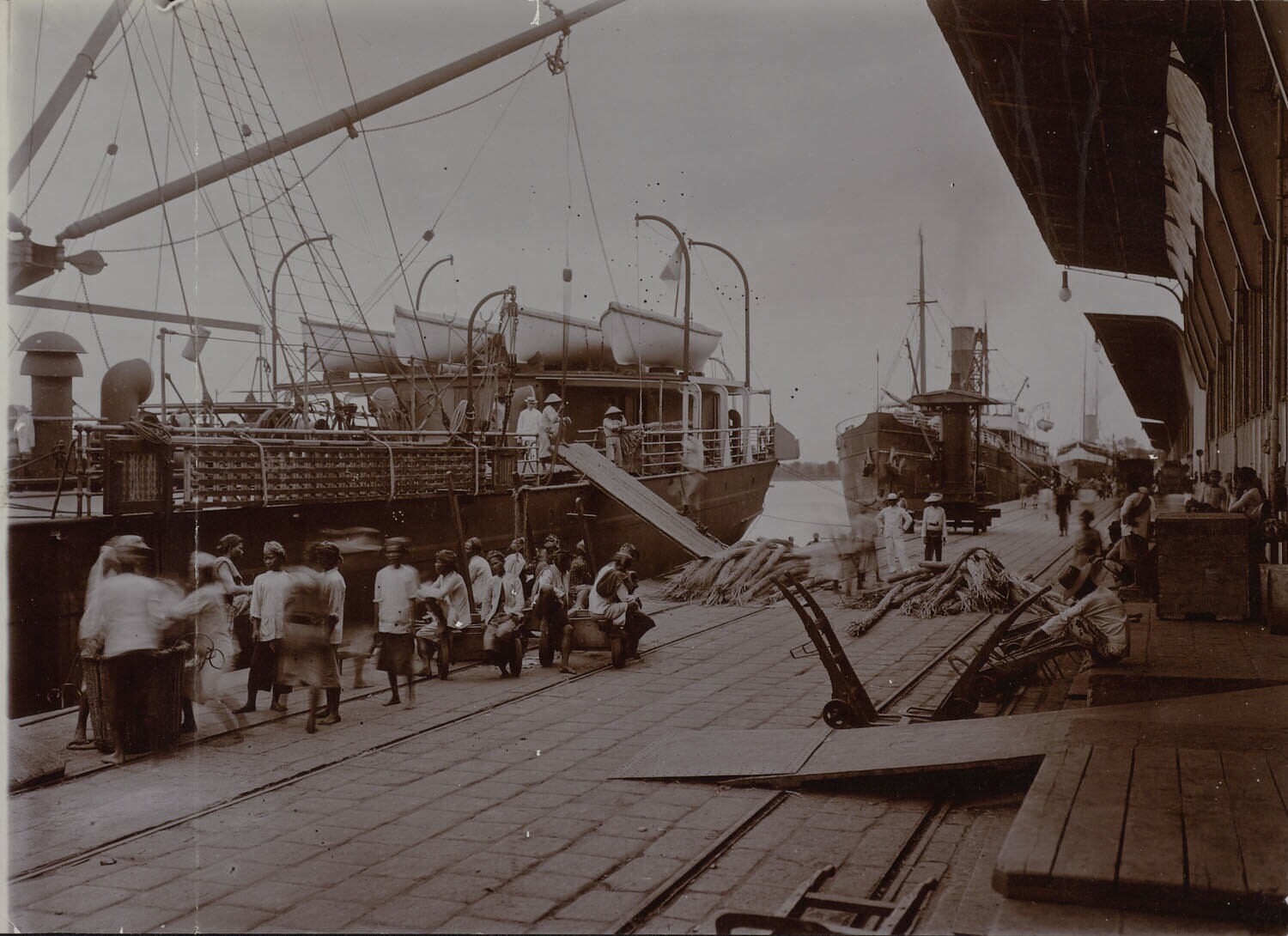 Arbeiders op de kade van een havenstad op Java wacht...