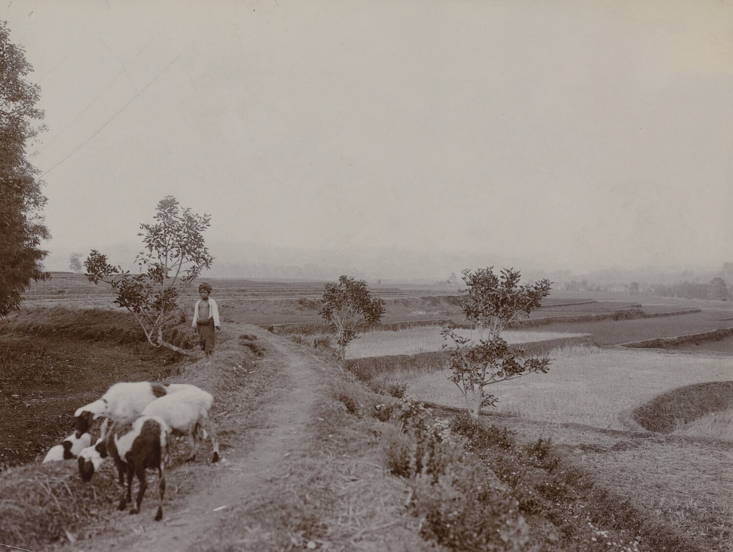 Javaanse jongen met geiten lopend op een pad langs l...