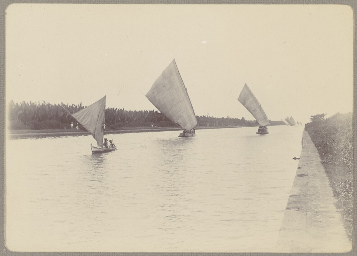 Kleine zeilschepen varend door kanaal, mogelijk in B...