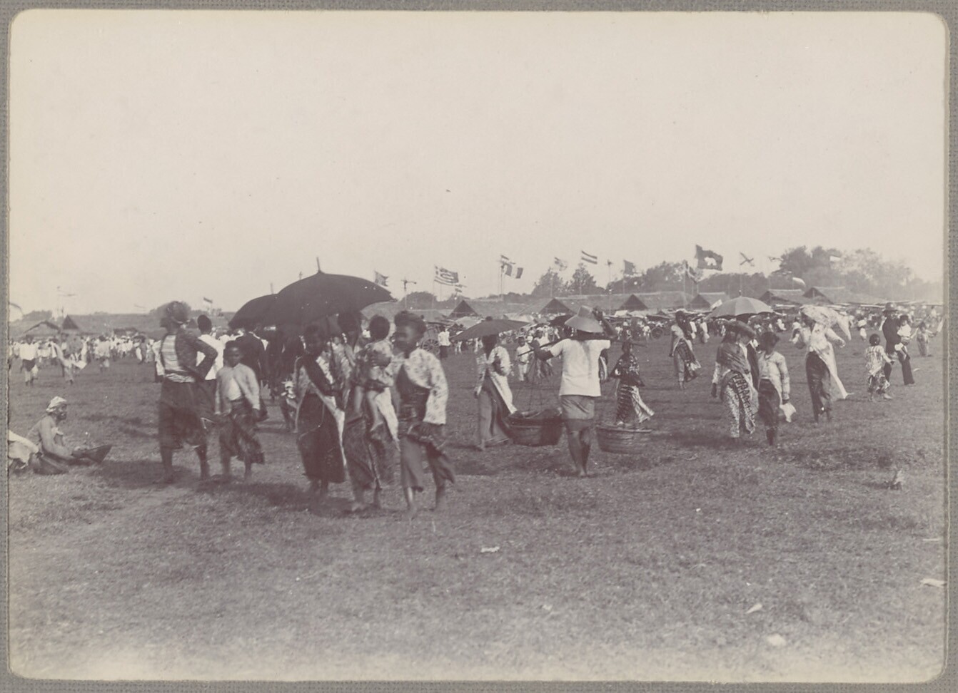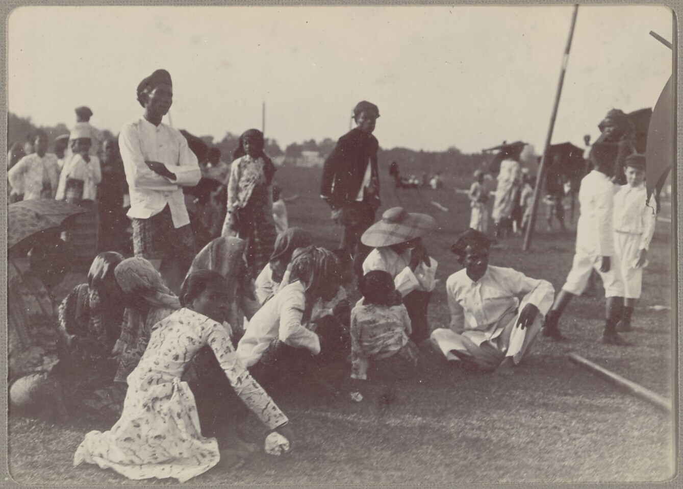 Groepsportret van Javanen verzameld op een open veld...