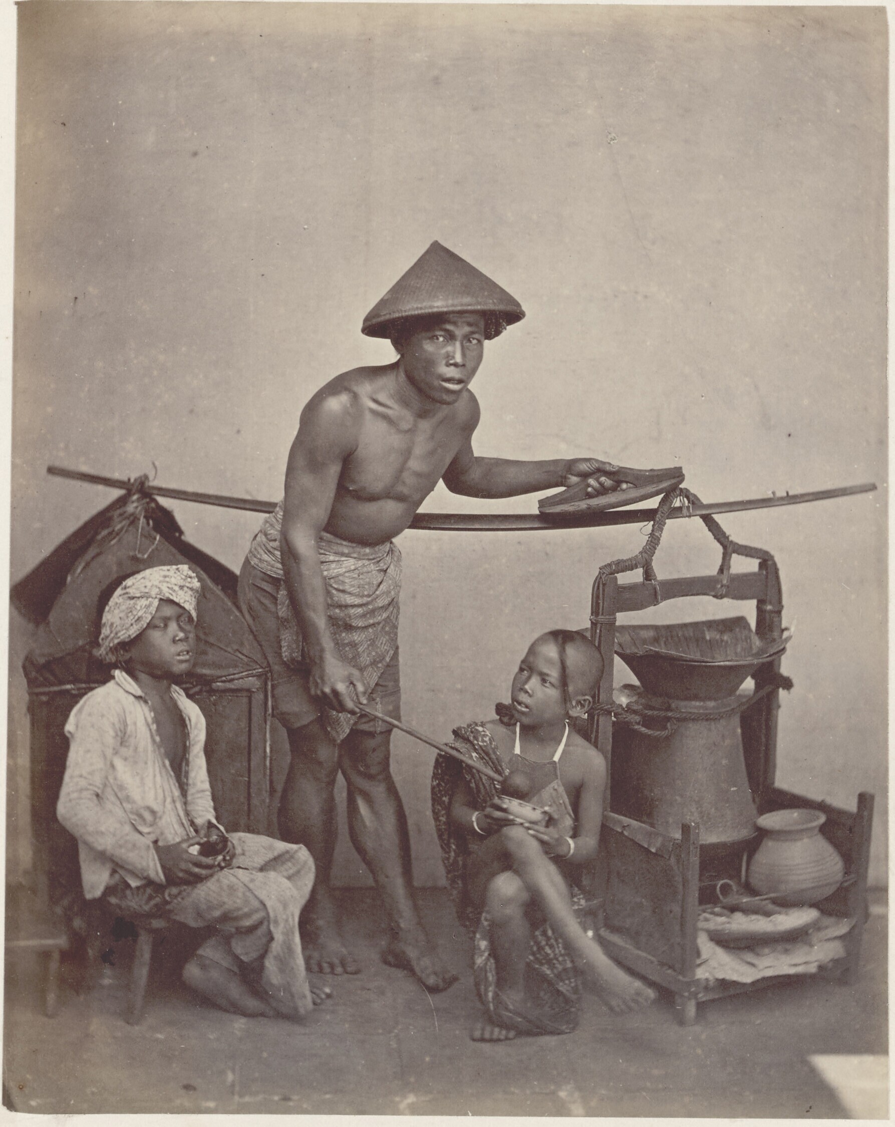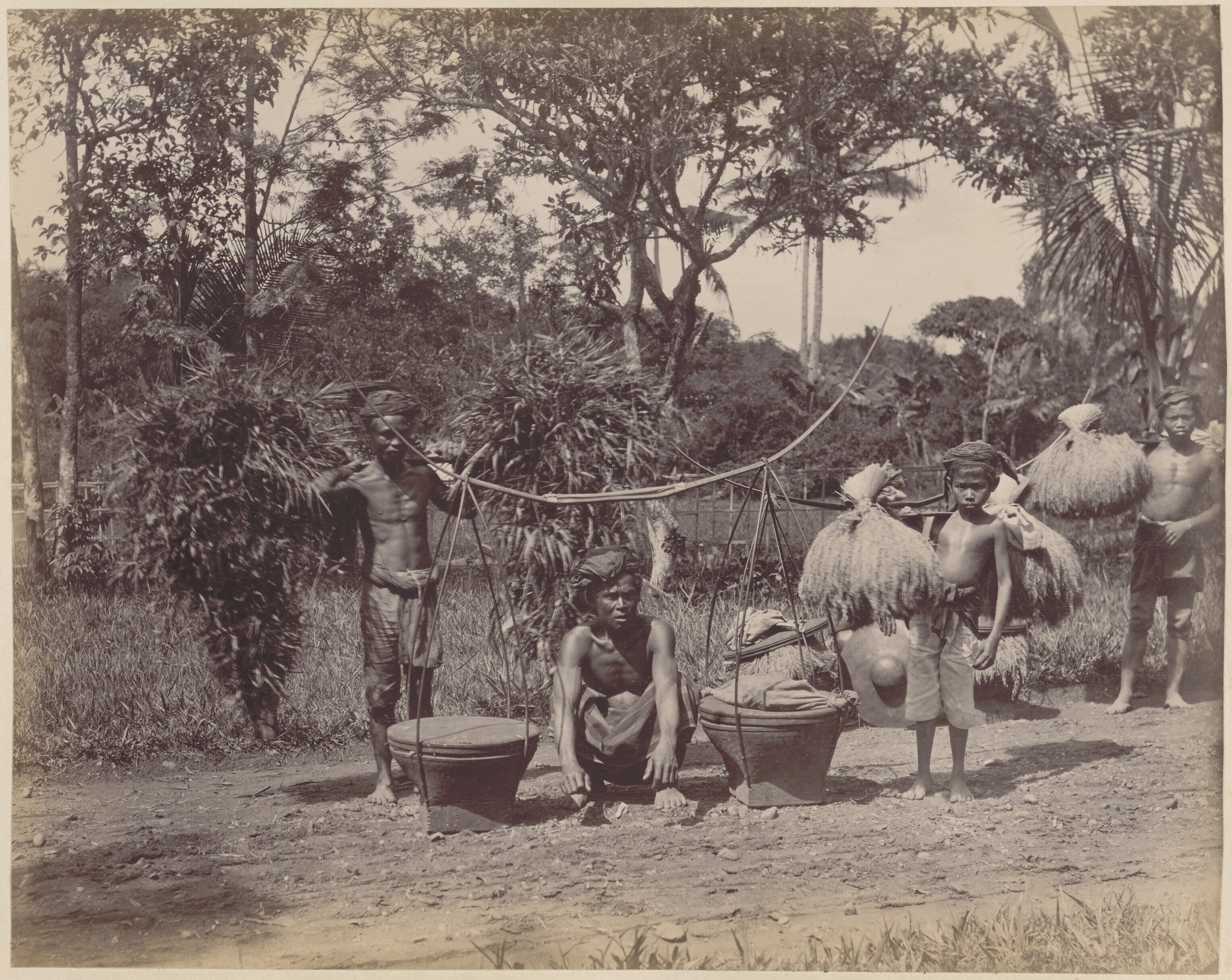 Groepsportret van Javaanse mannen en jongens met juk...