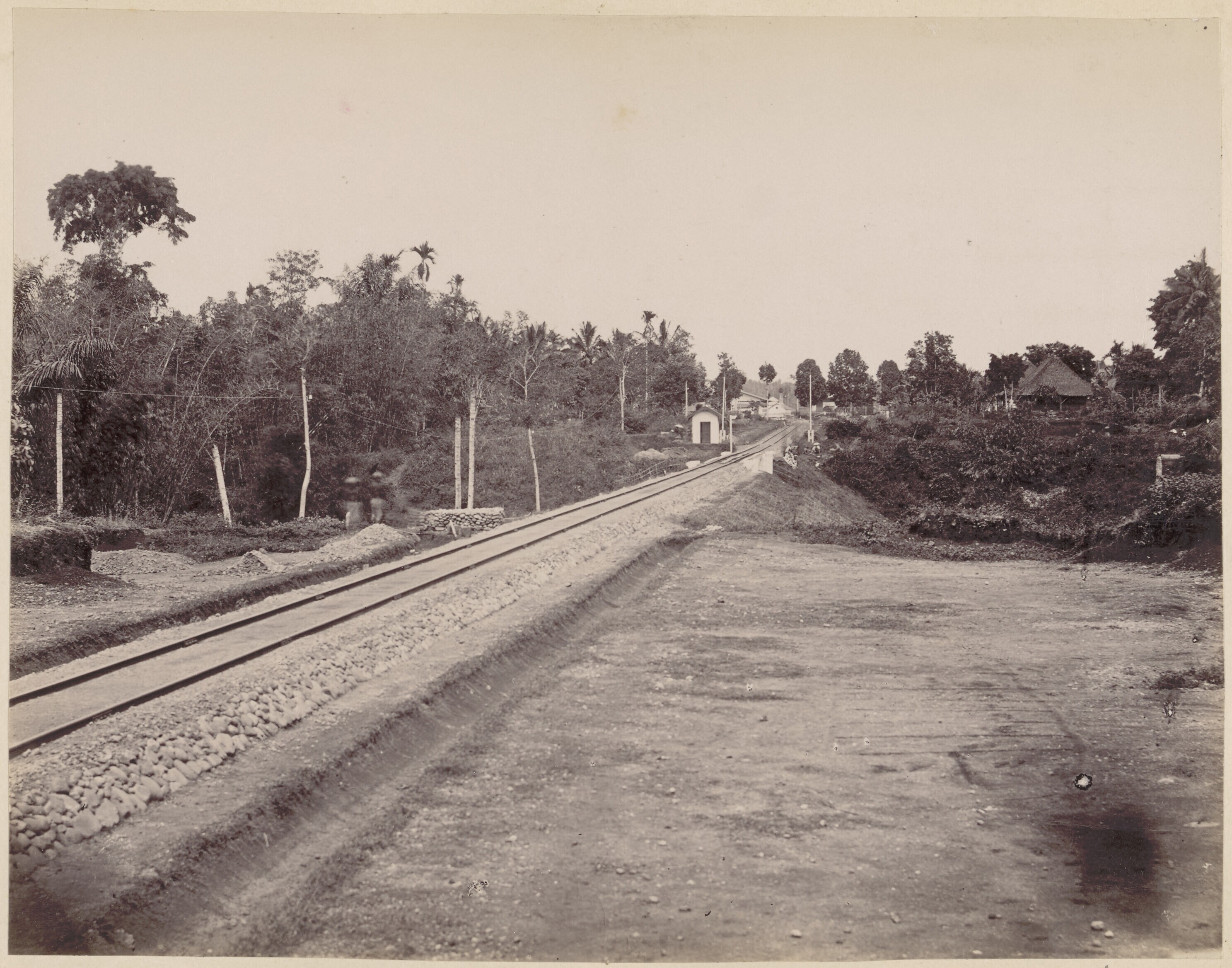 Spoorlijn op Java met omliggende bebouwing en bos aa...