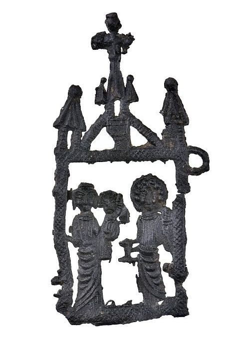 Opengewerkt pelgrimsinsigne, Maria met kind, engel m...