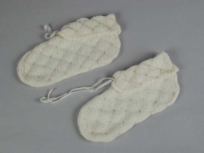 Paar bedsokken, gebreid in ajour van dunne witte wol