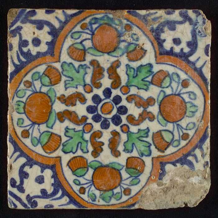Ornamenttegel, rozet waarboven oranjeappels en gouds...