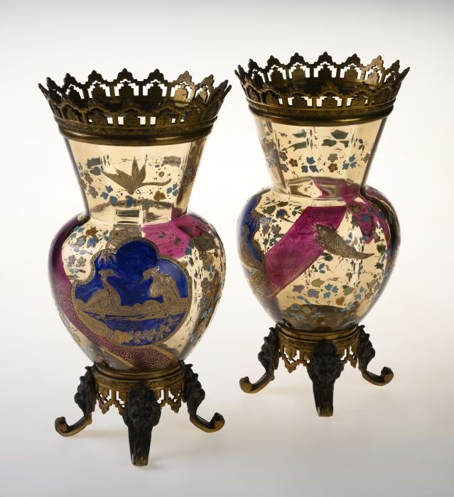 Stel glazen vazen met messing voet en rand
