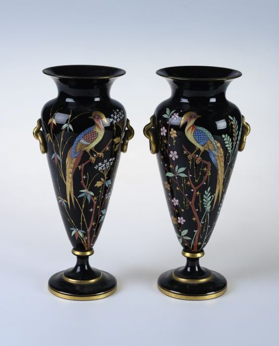 Stel zwarte glazen vazen, veelkleurig beschilderd