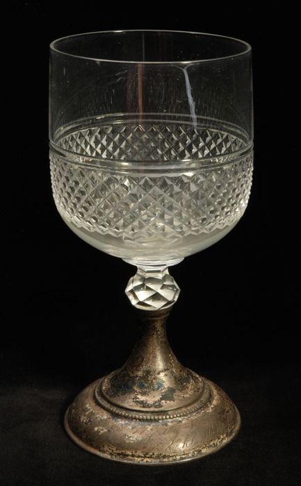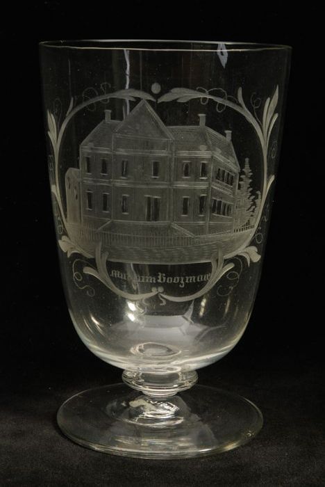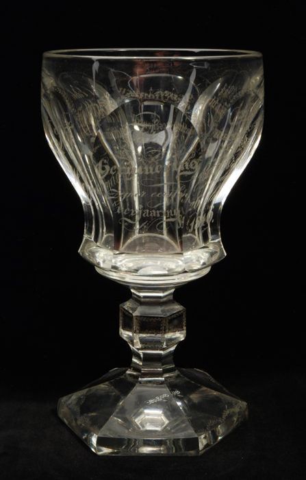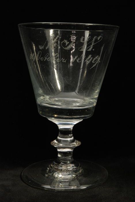 Dikwandig kelkglas, wijnglas, gegraveerd met opschri...