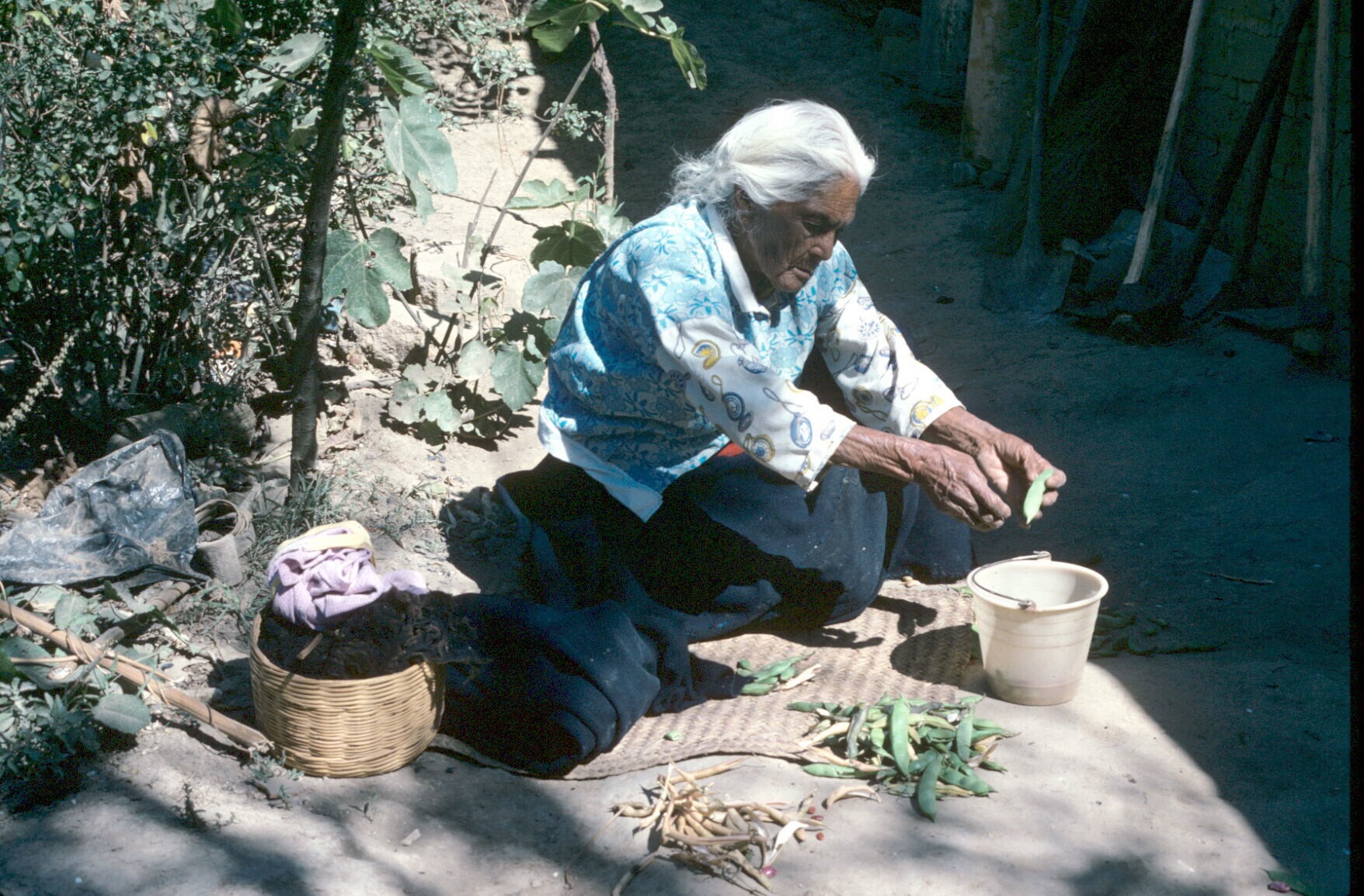 bejaarde verwante van Loreto Jarriza, bonen doppend ...